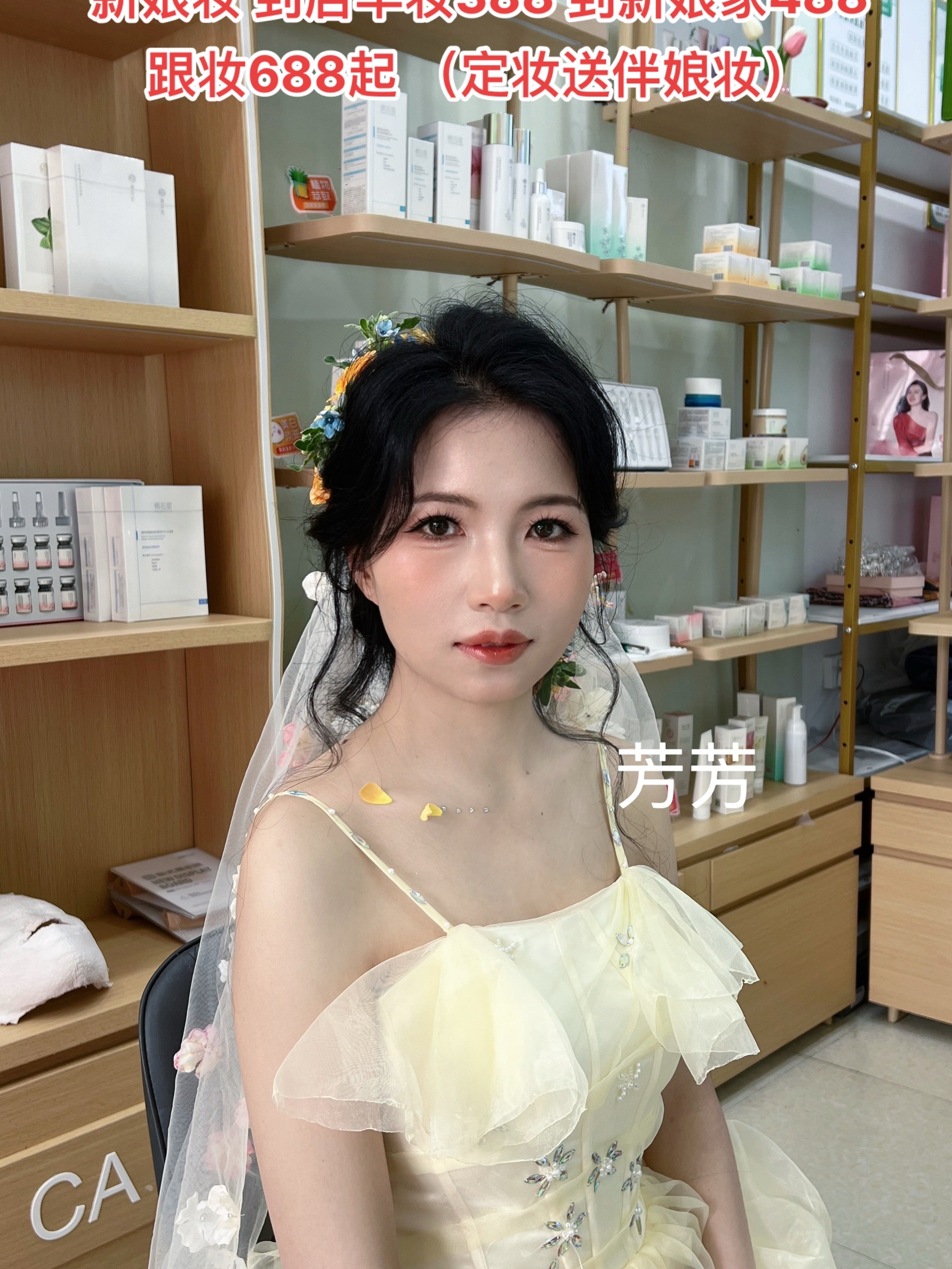“跟朋友一起去,我们都化了,化妆师很认真,跟我们说了很多对皮肤保养的知识,感觉很合得来,还会再去的,结婚也要选择你们家!祝老板生意兴隆!