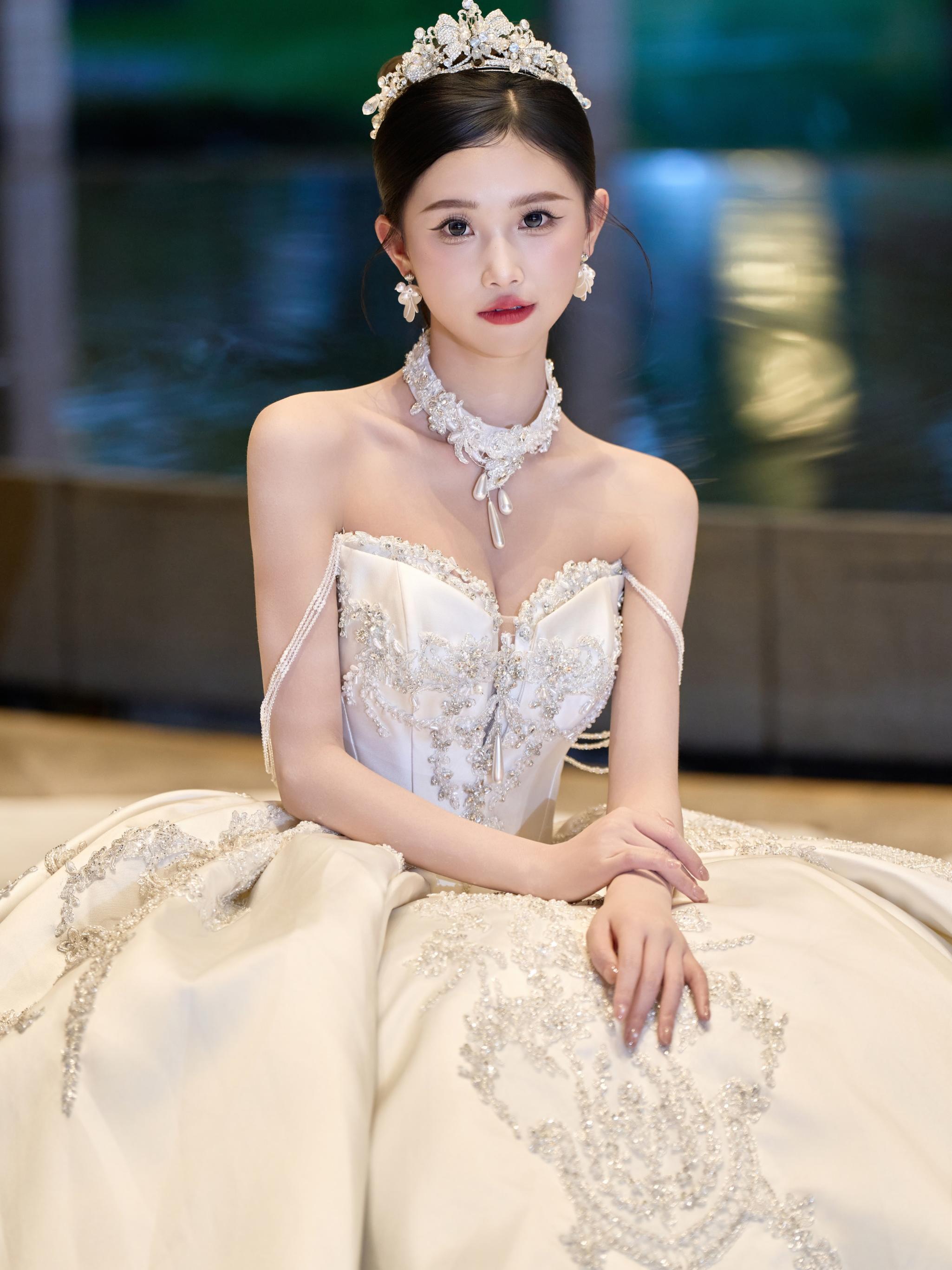 加宽一字肩重工拖尾主纱