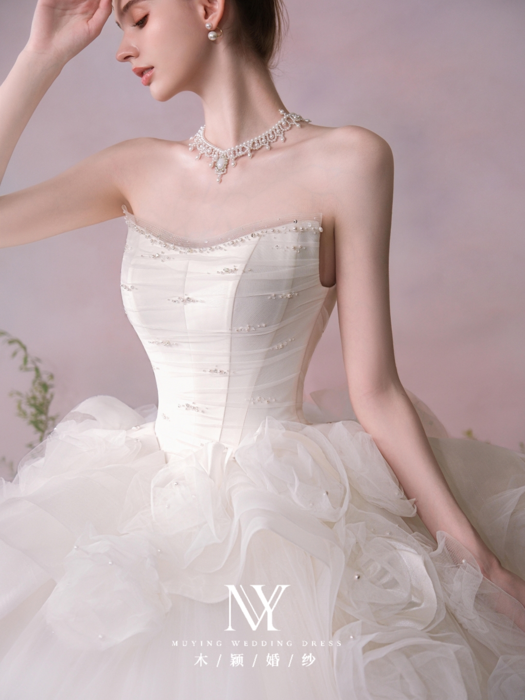 抹胸缎面鱼尾珍珠婚纱