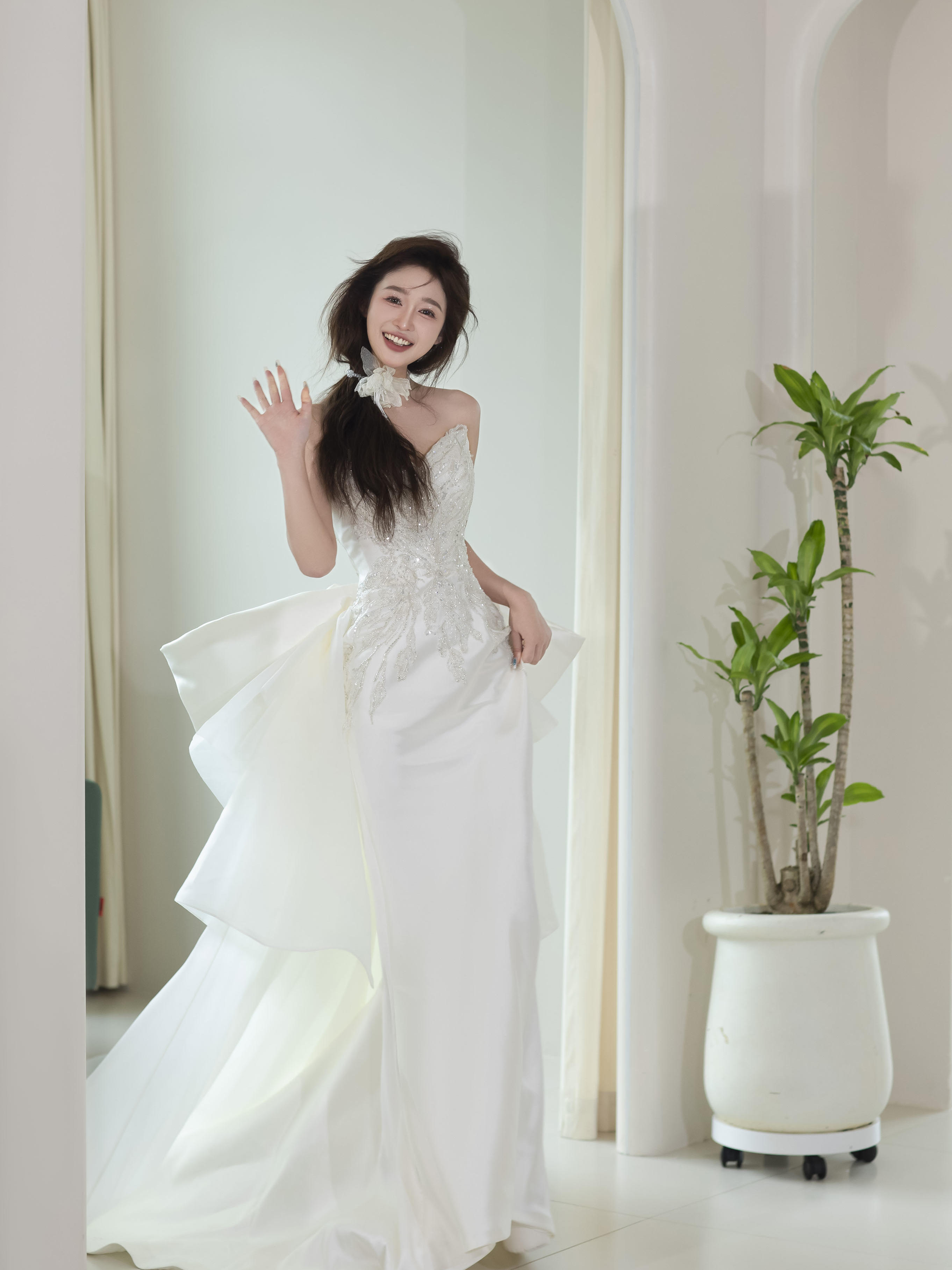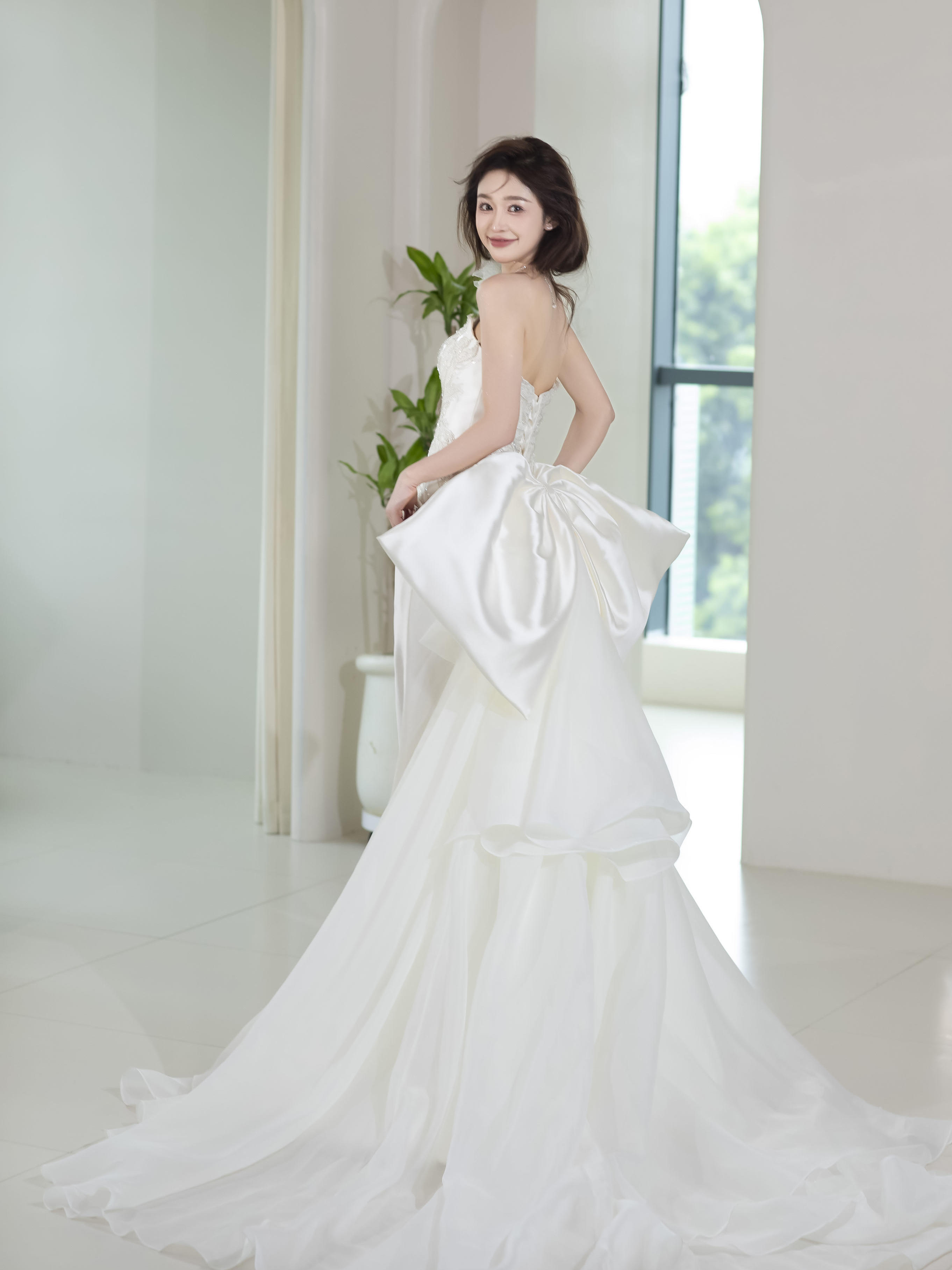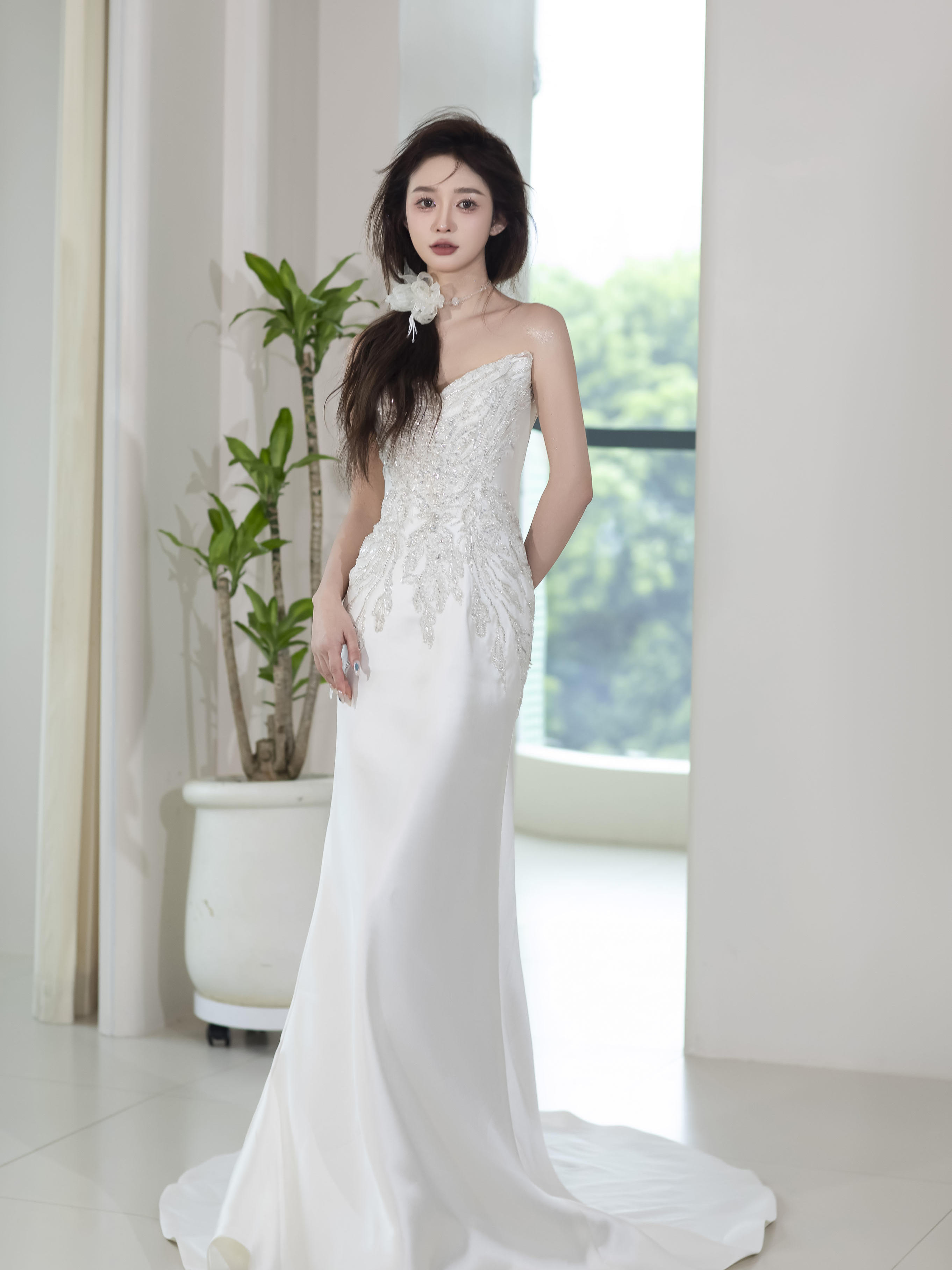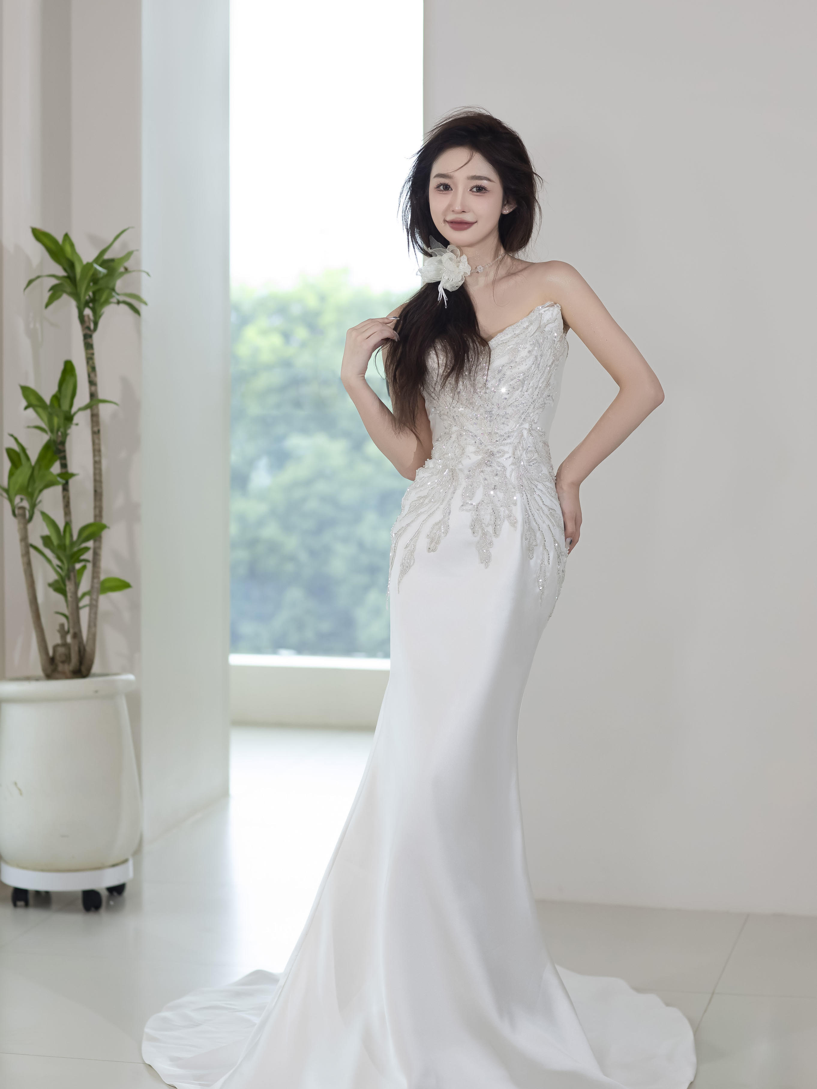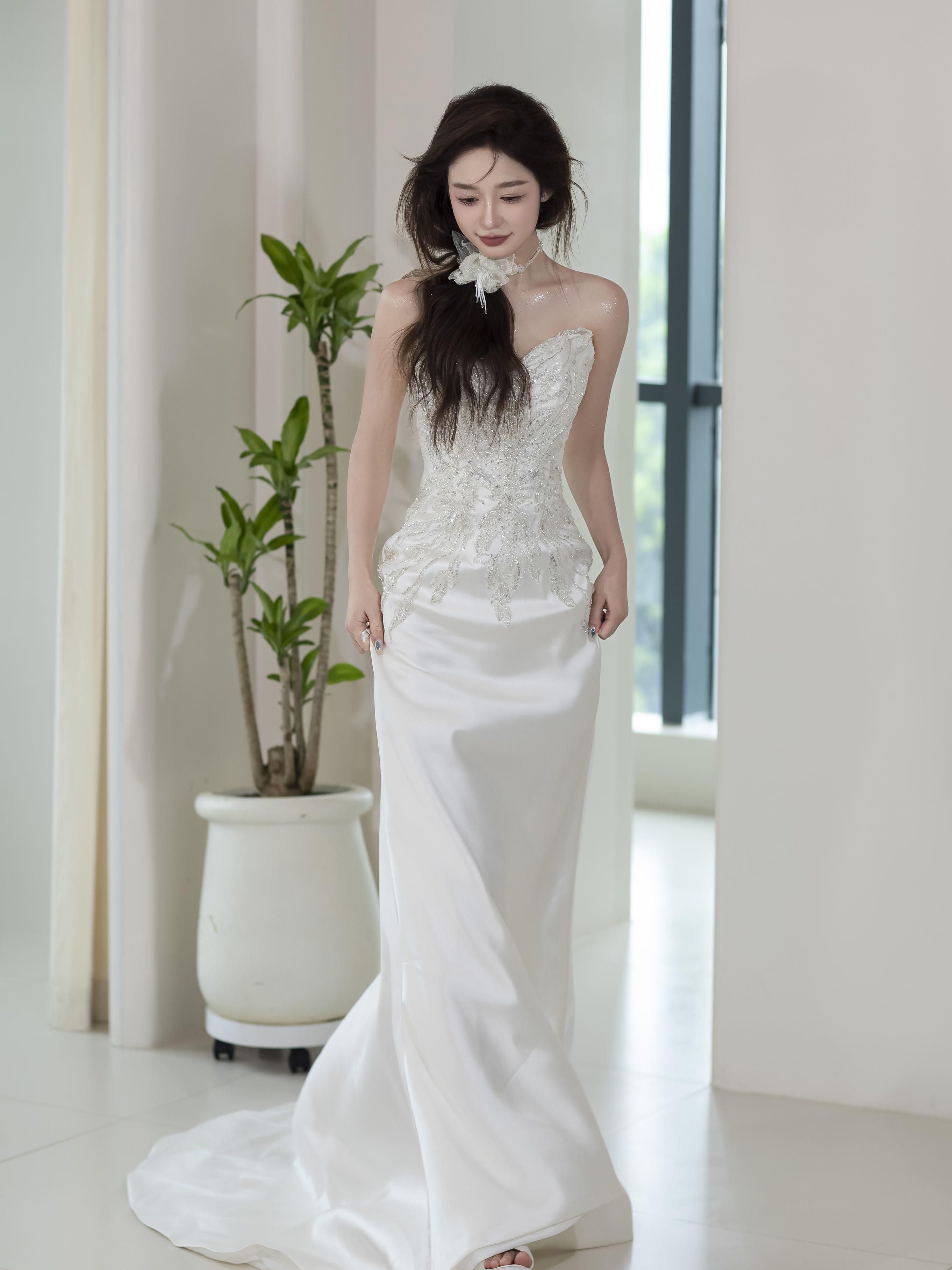 慵懒感超温柔缎面抹胸鱼尾纱
