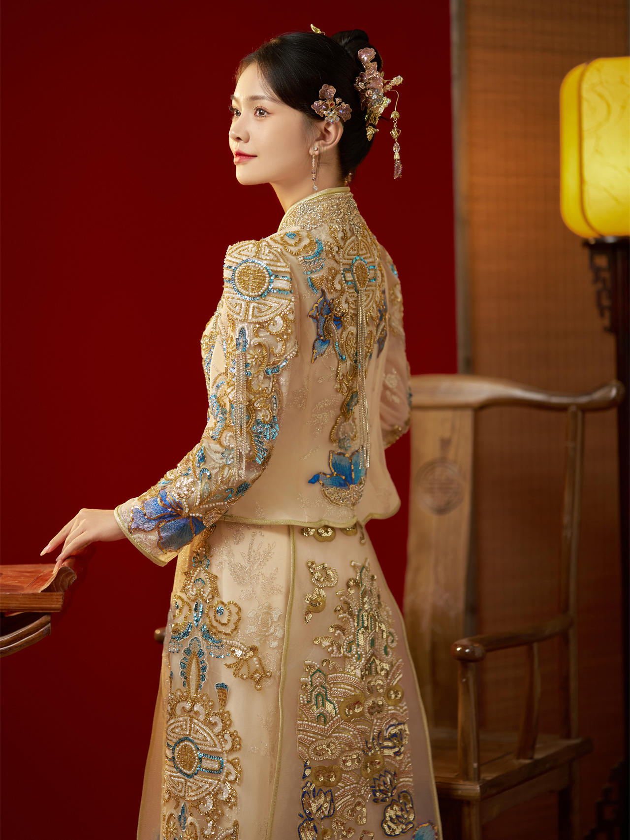 备婚的姐妹必冲的蓝金色中式秀禾服