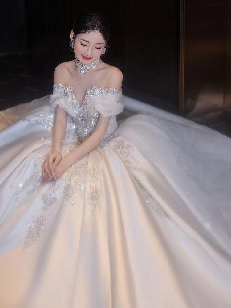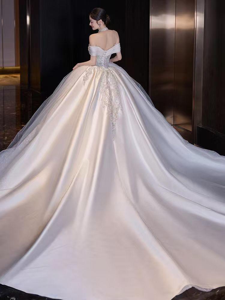 一字肩缎面婚纱