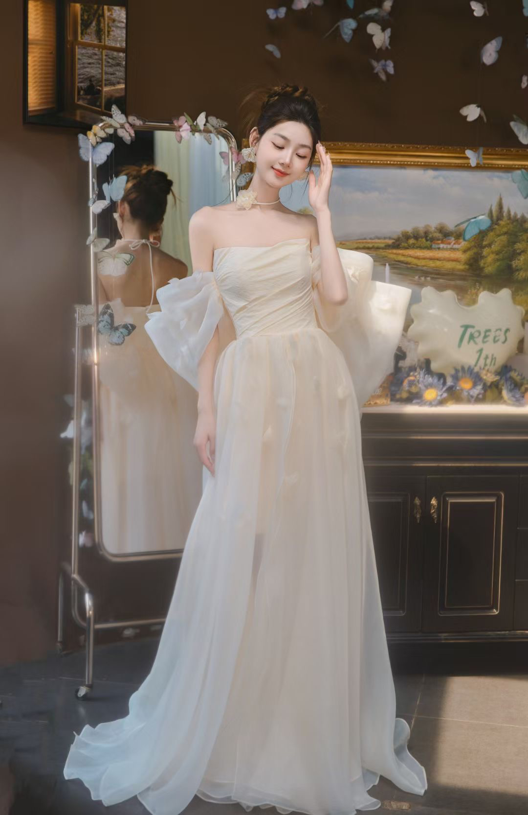 一字肩丝绒敬酒服