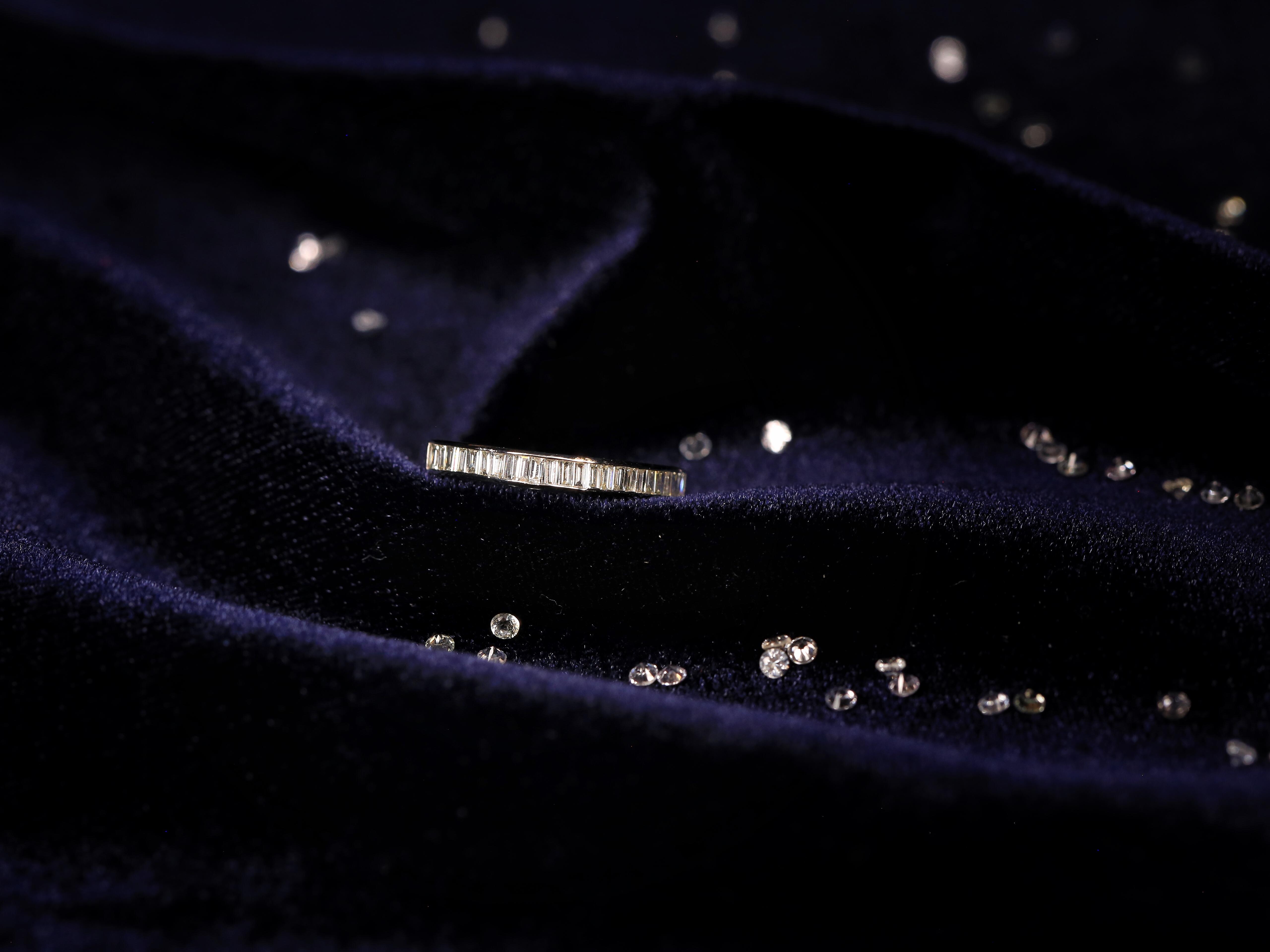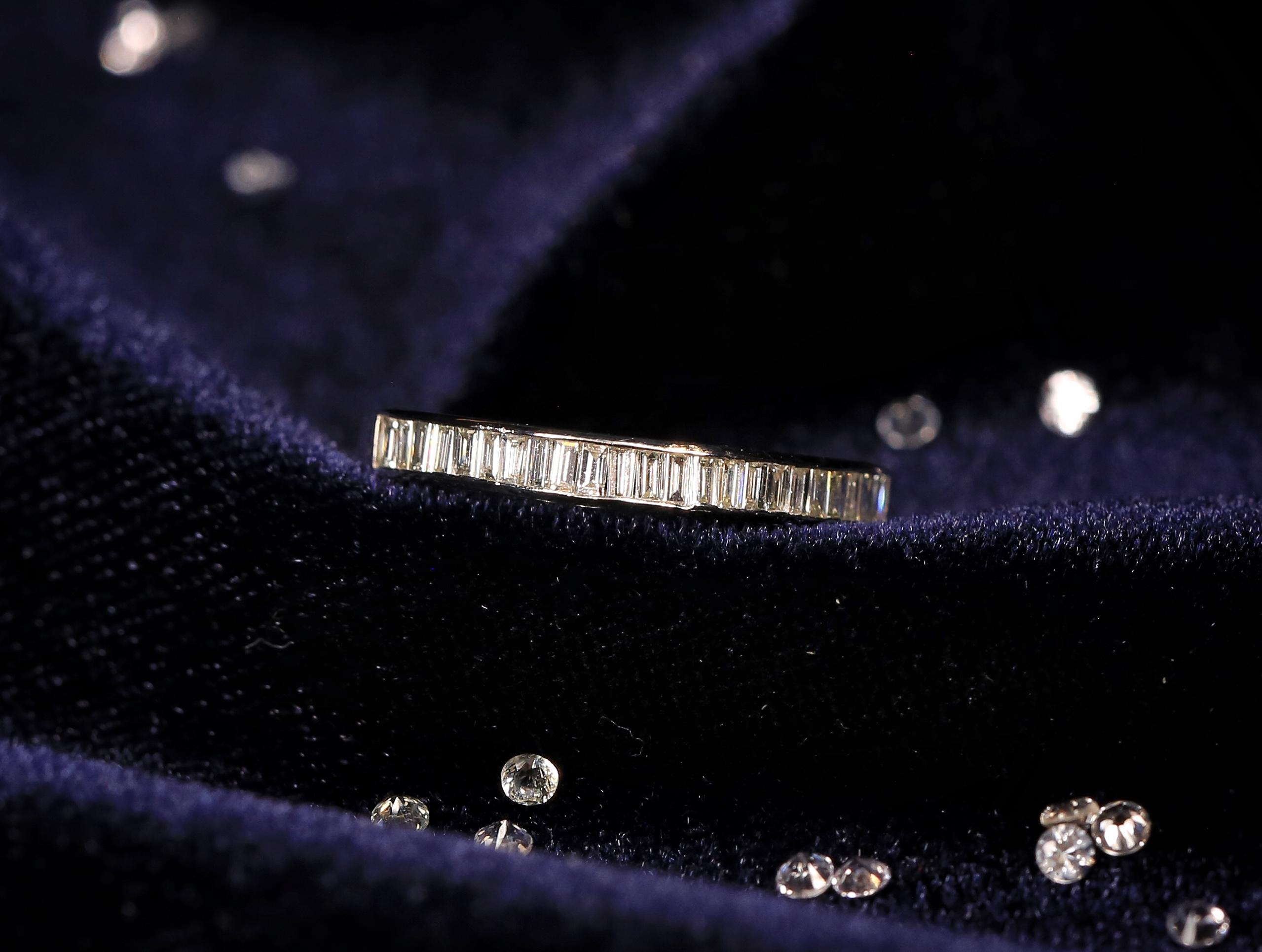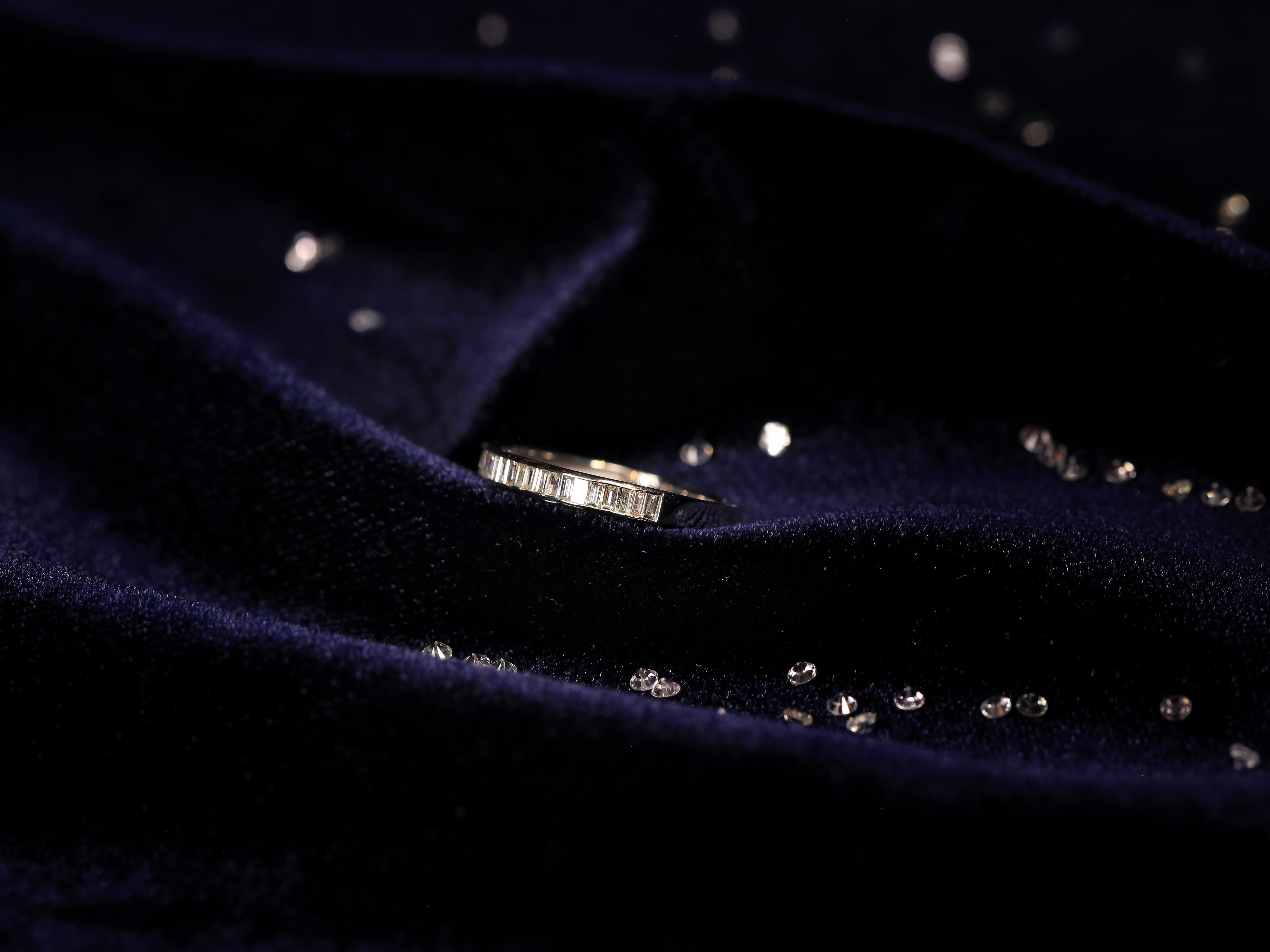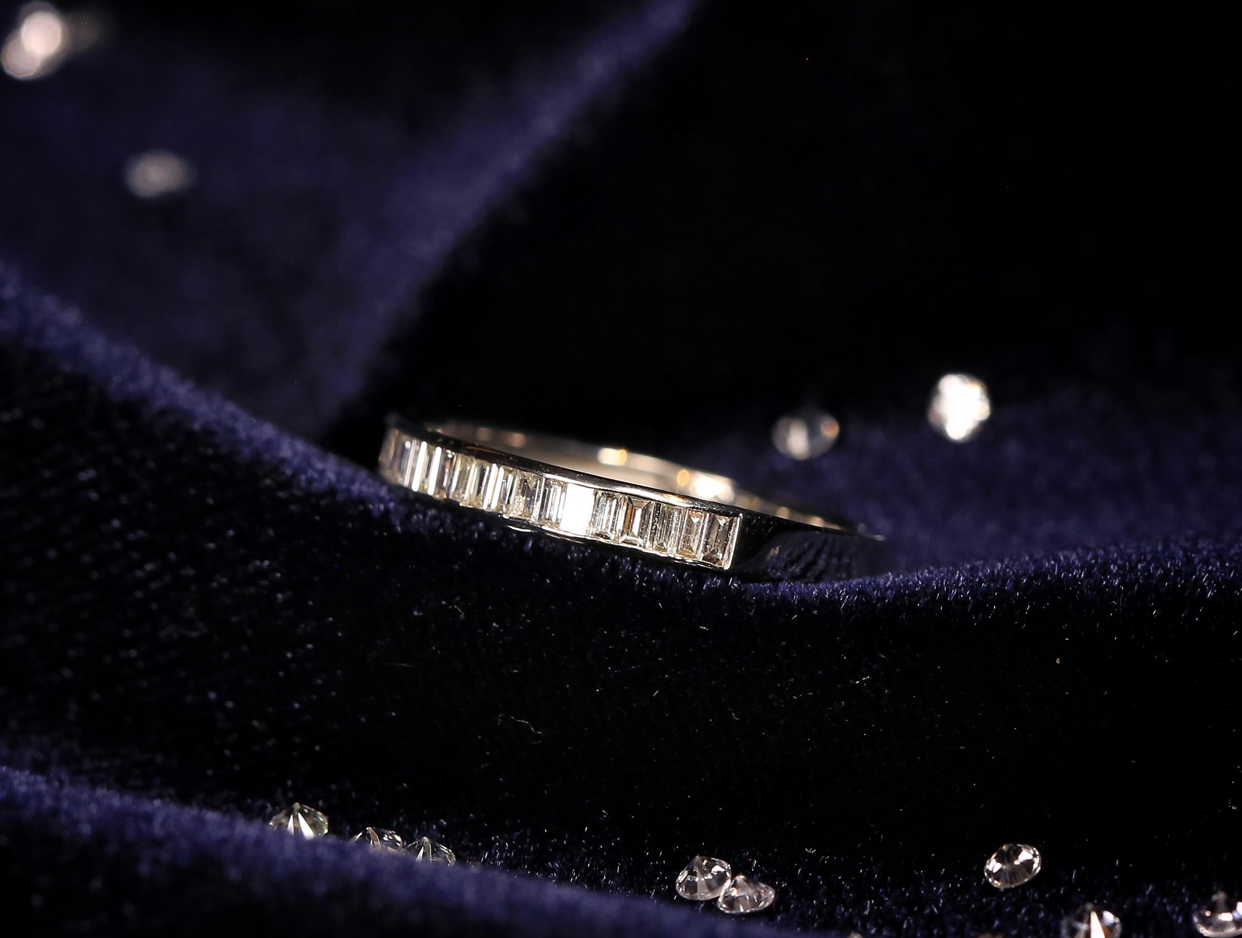 【star】-铂金梯方钻排戒<br />梯方钻,英文名Baguette diamonds,尽管它们不是最闪亮的切割方式,但长而精巧的造型给整个珠宝首饰带来了低调奢华的感觉。它更多具有的是一种敏锐的几何感觉,也更多的在现代设计中担任主角。有梯方钻加入的珠宝设计,总是给人以简练、纯粹、时尚的印象.<br />我们设计师将几组梯形钻组合在一起,做成了排戒,想法更加大胆和干练,使其佩戴者更加时尚和自信