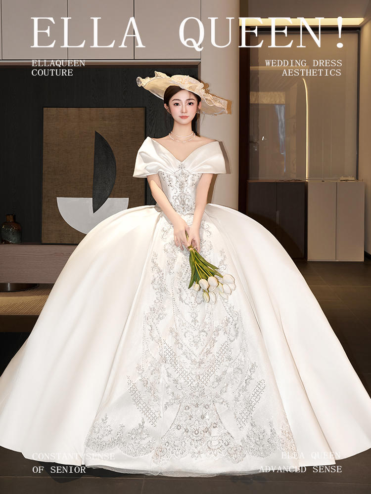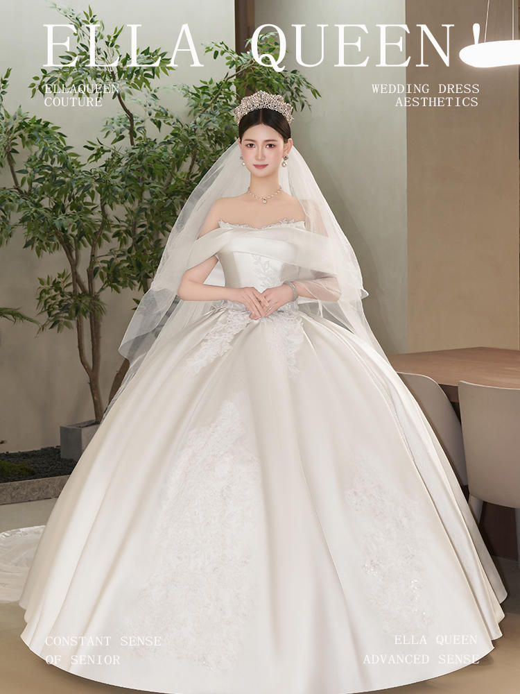 【甜美减龄】缎钻一字肩齐地婚纱