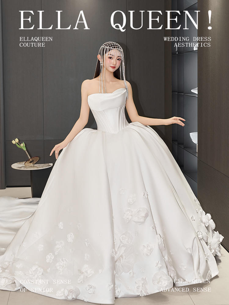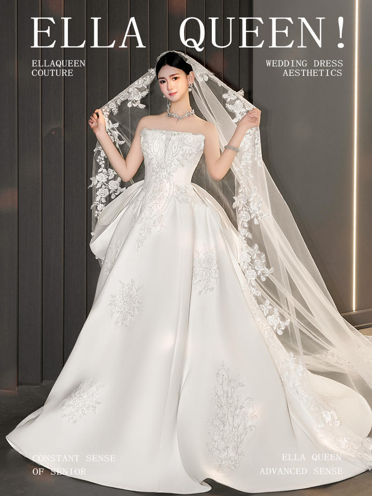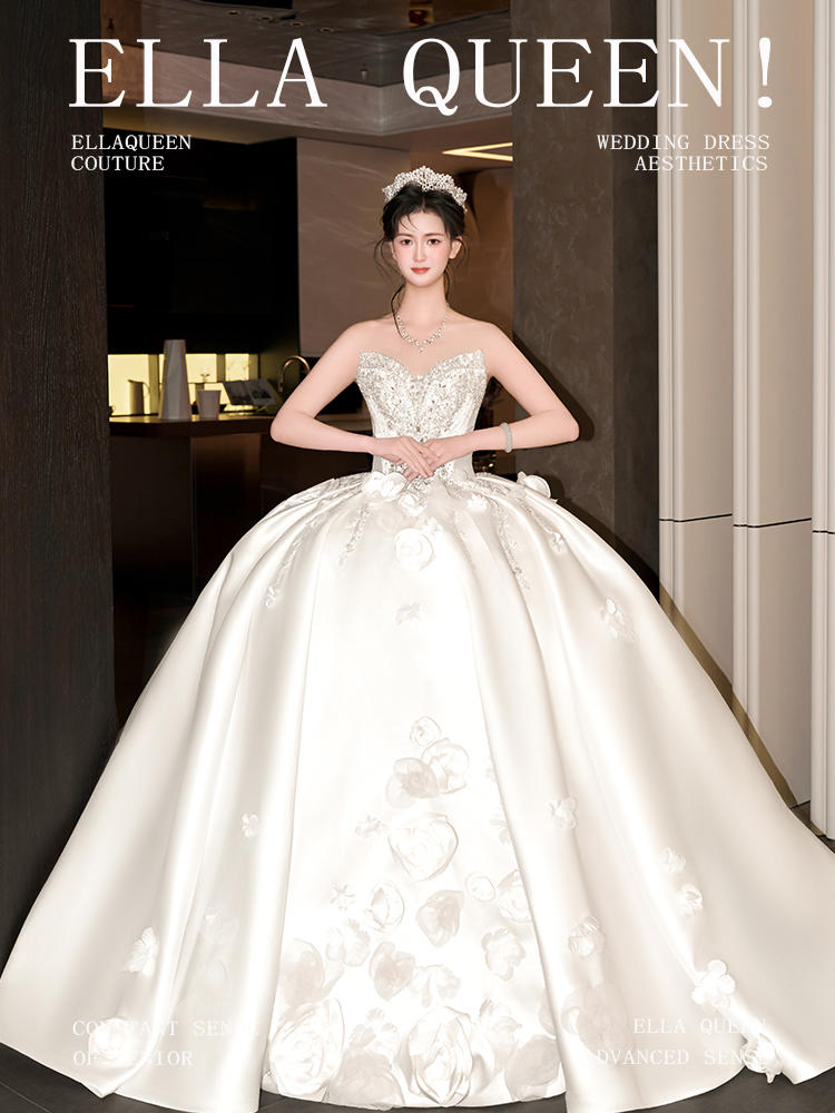 【氛围拉满】重磅缎面花朵拖尾婚纱