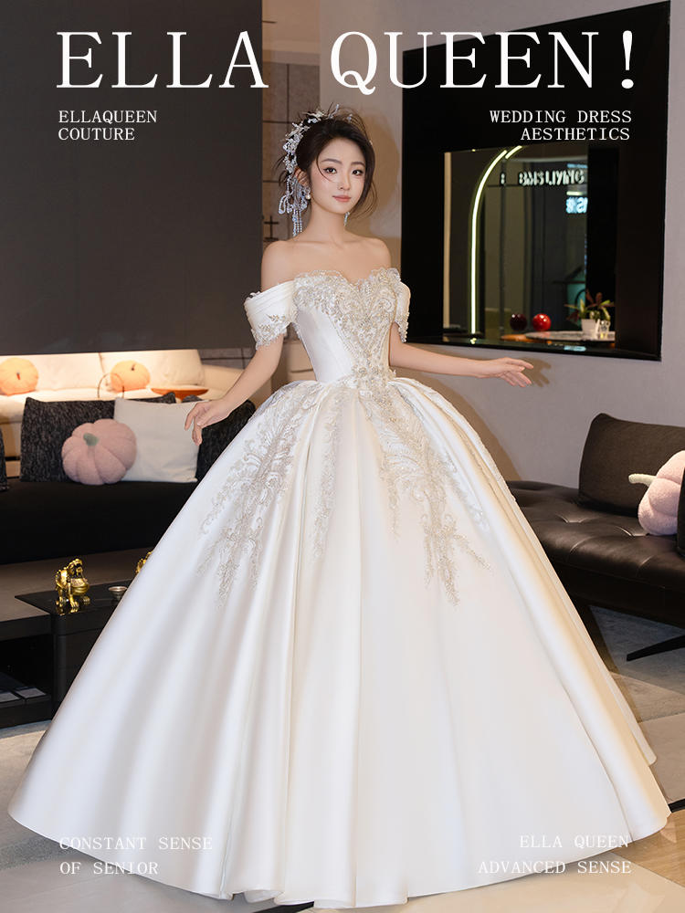 【优雅大气】一字肩缎面齐地婚纱