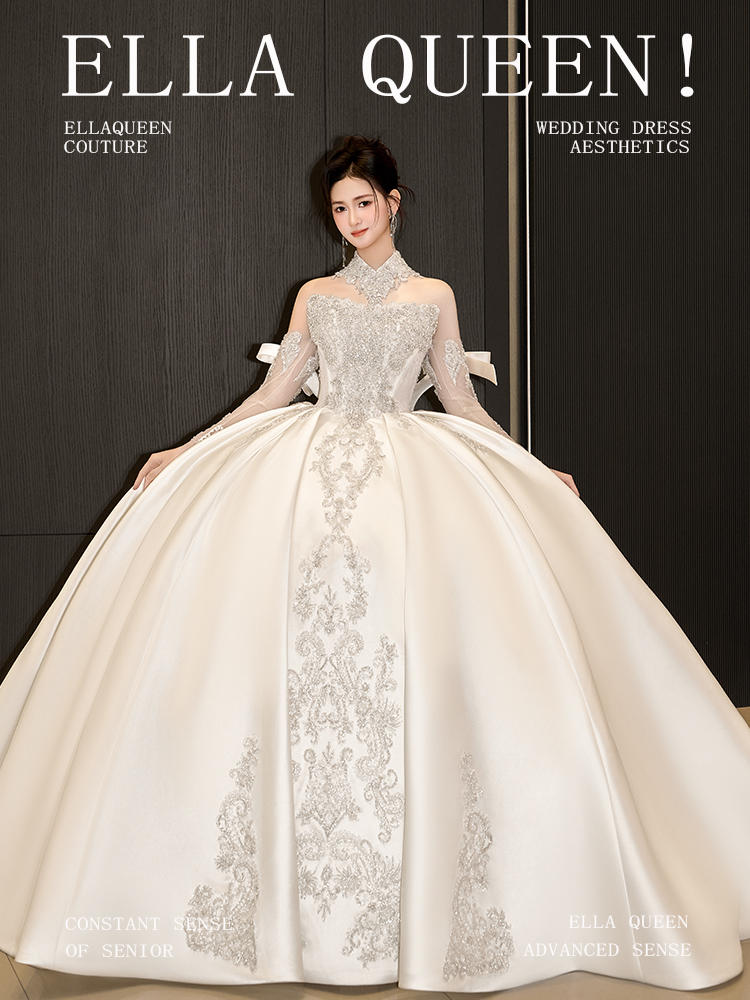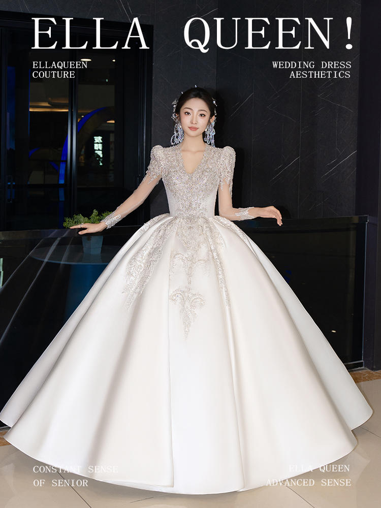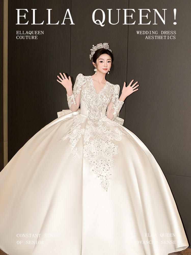 【古典优雅】重工新款长袖缎面婚纱