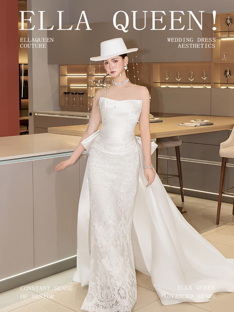 【复古摩登】缎面蕾丝鱼尾婚纱气质