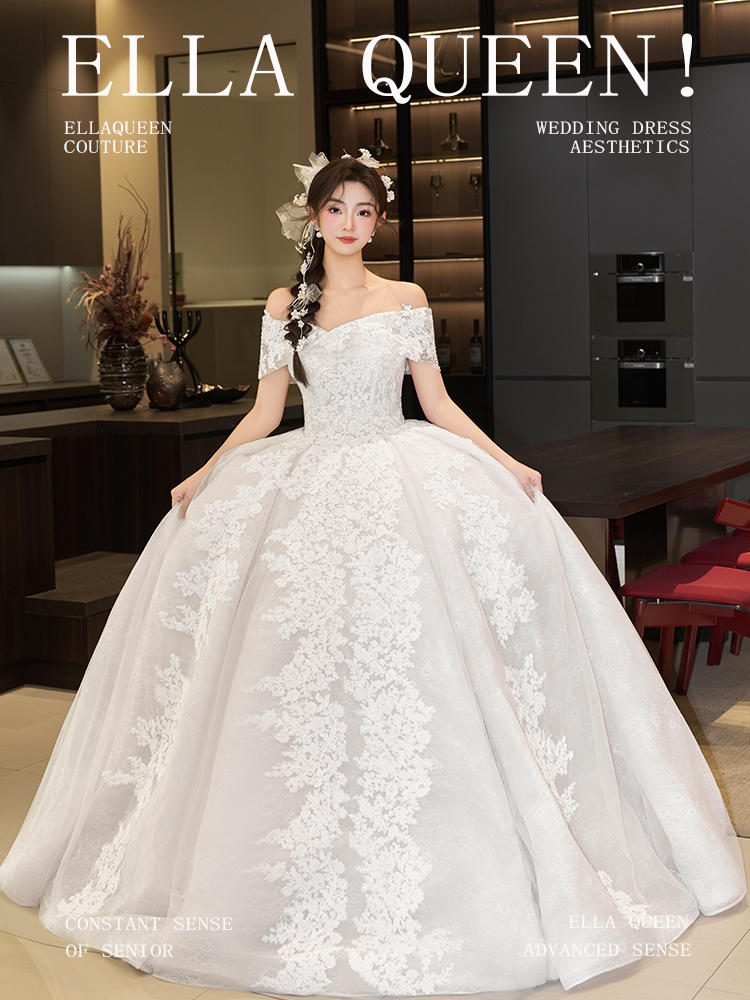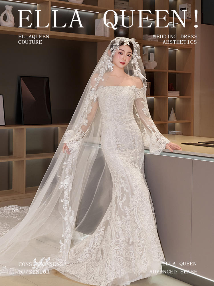 【梦中情纱】蕾丝一字肩拖尾婚纱