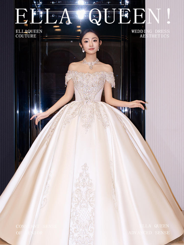 【重工新款】一字肩缎钻齐地婚纱