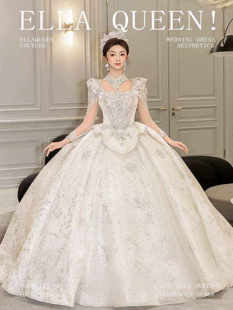 【重工新款】长袖方领闪钻婚纱大拖