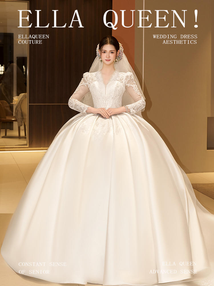 【贵气优雅】长袖V领缎面拖尾婚纱