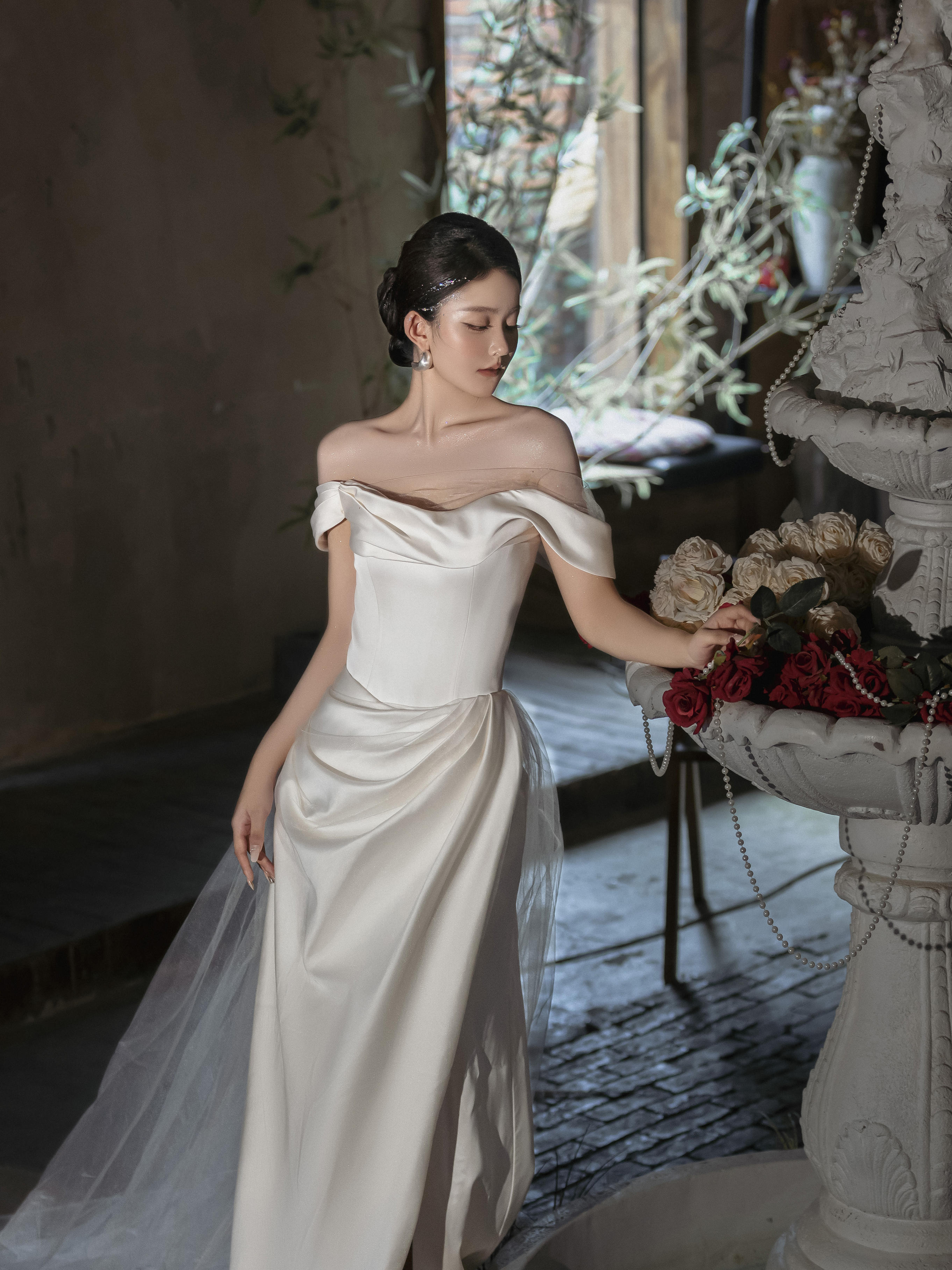小众缎面一字肩婚纱