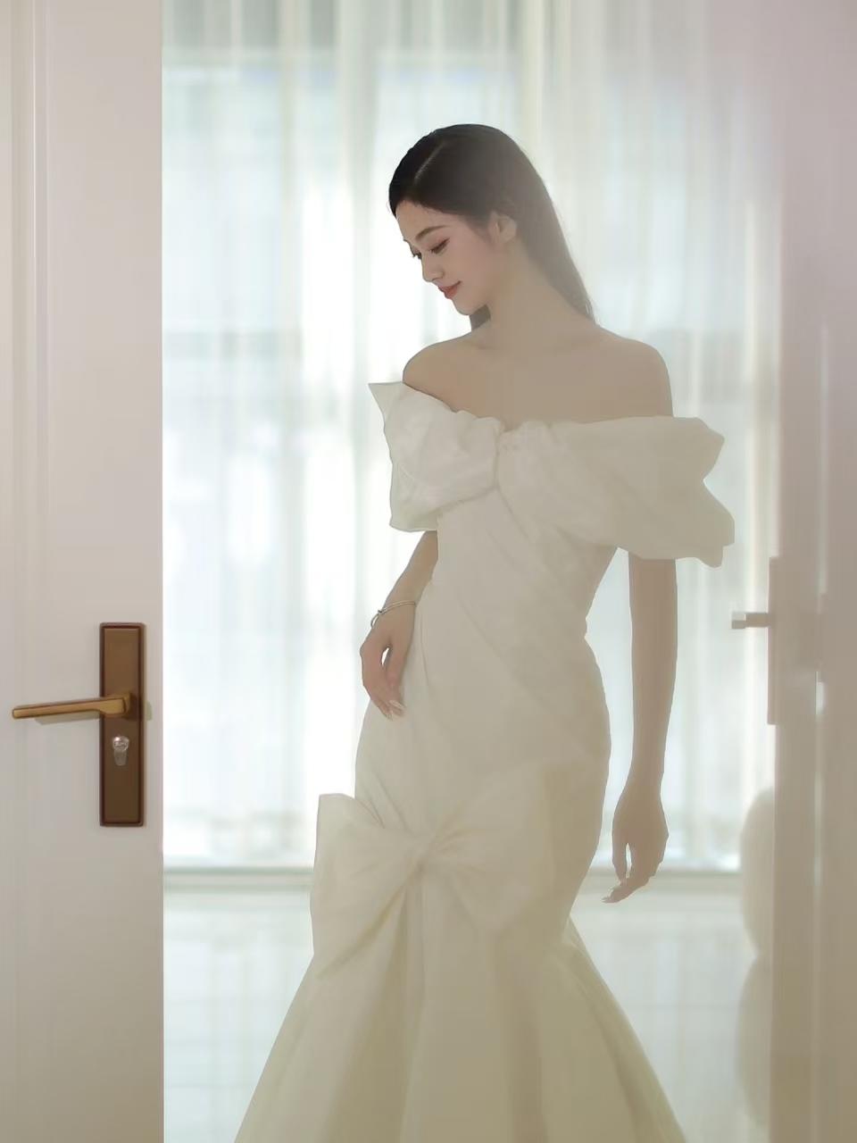缎面鱼尾蝴蝶结婚纱