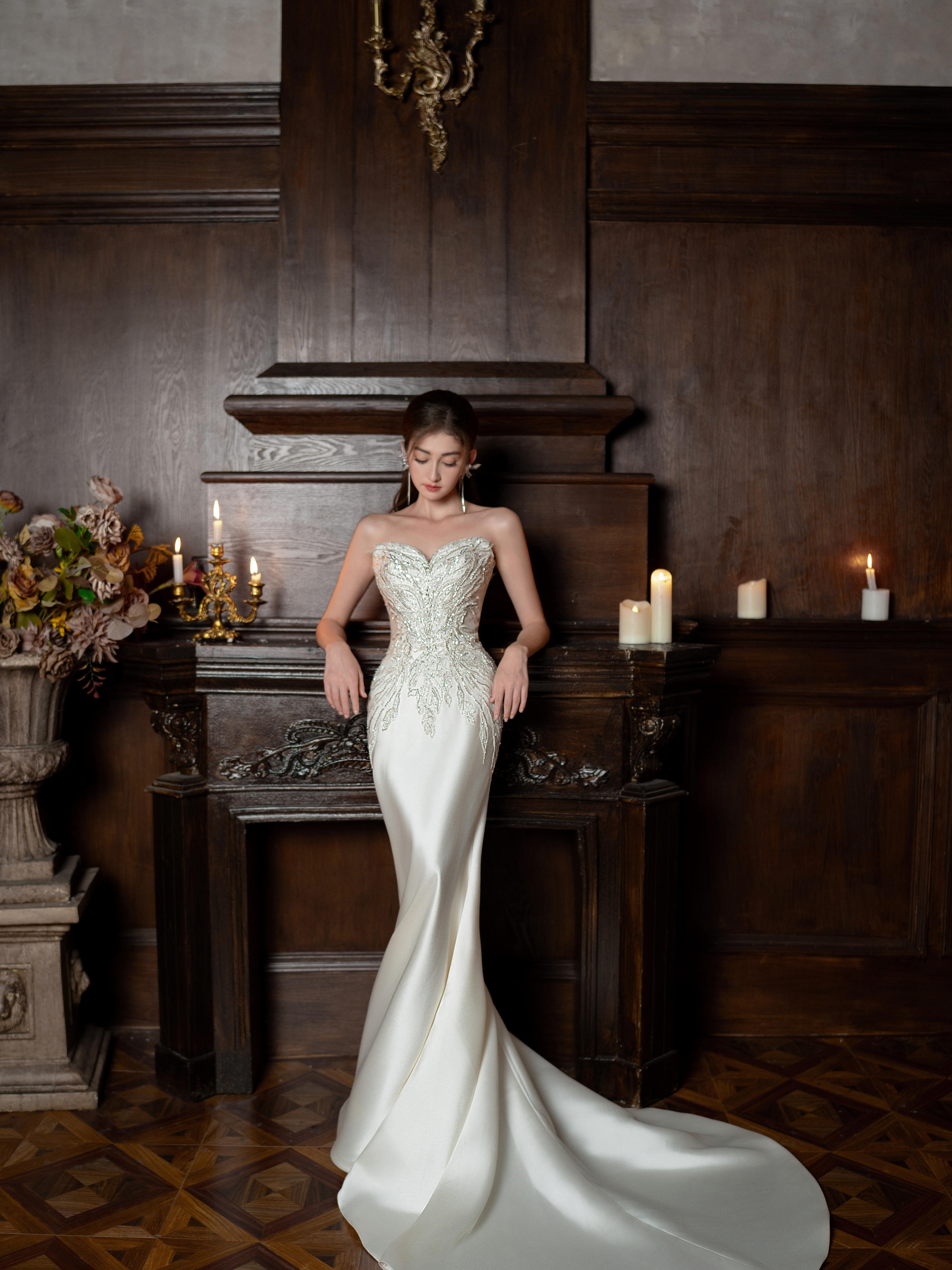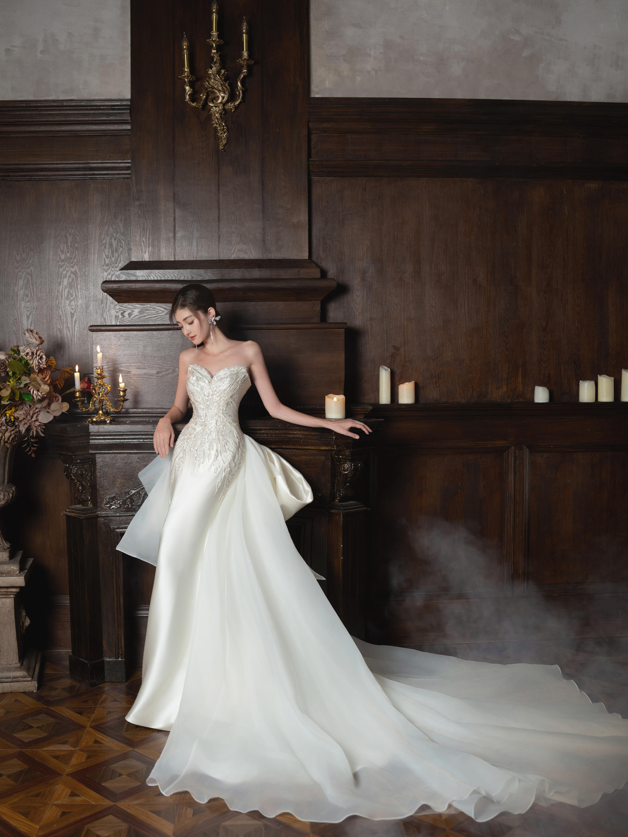 重工缎面闪钻抹胸大拖尾