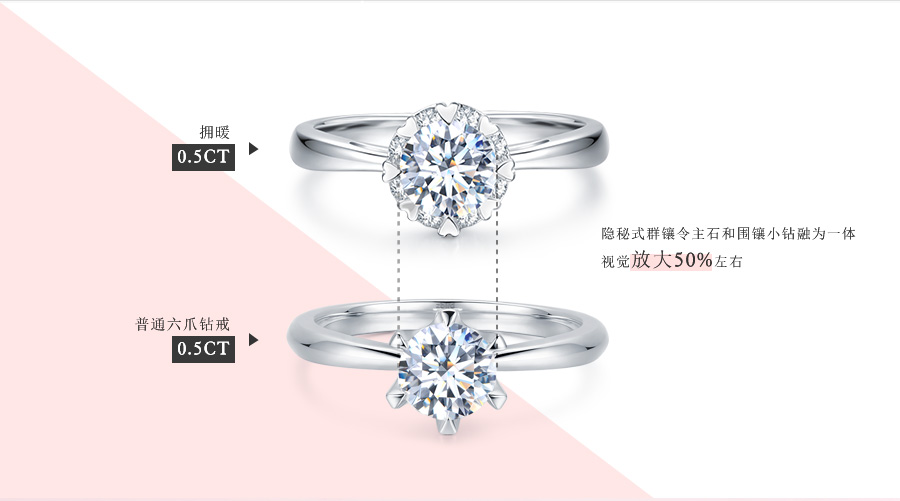 承载新人美满爱情和幸福未来的捧花<br /> 是婚姻的守护者<br /> 给予爱人携手一生的力量<br /> 将这一美好寓意融入婚戒设计<br /> 是呵护新娘一生的承诺