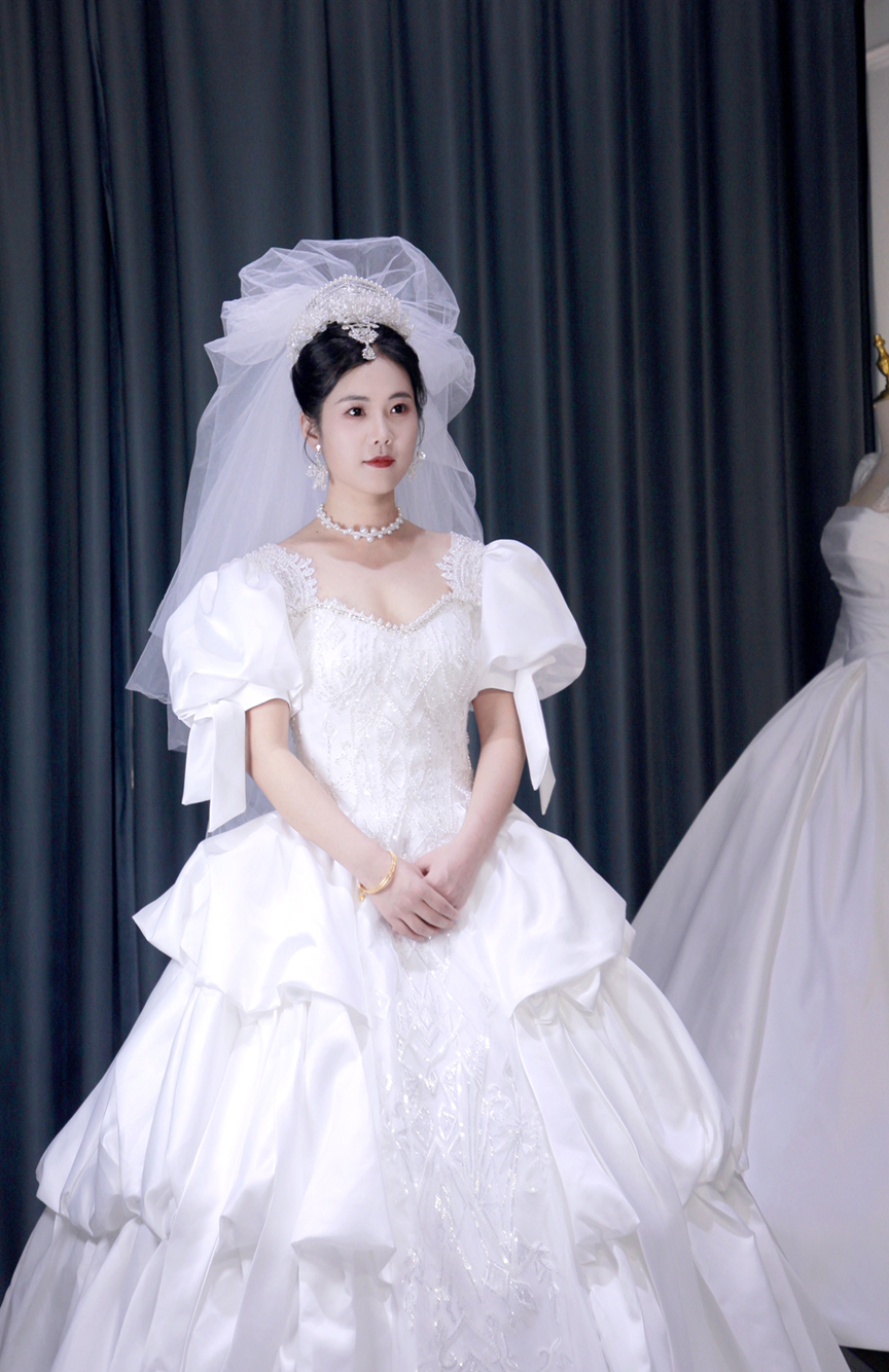 泡泡袖缎面齐地婚纱