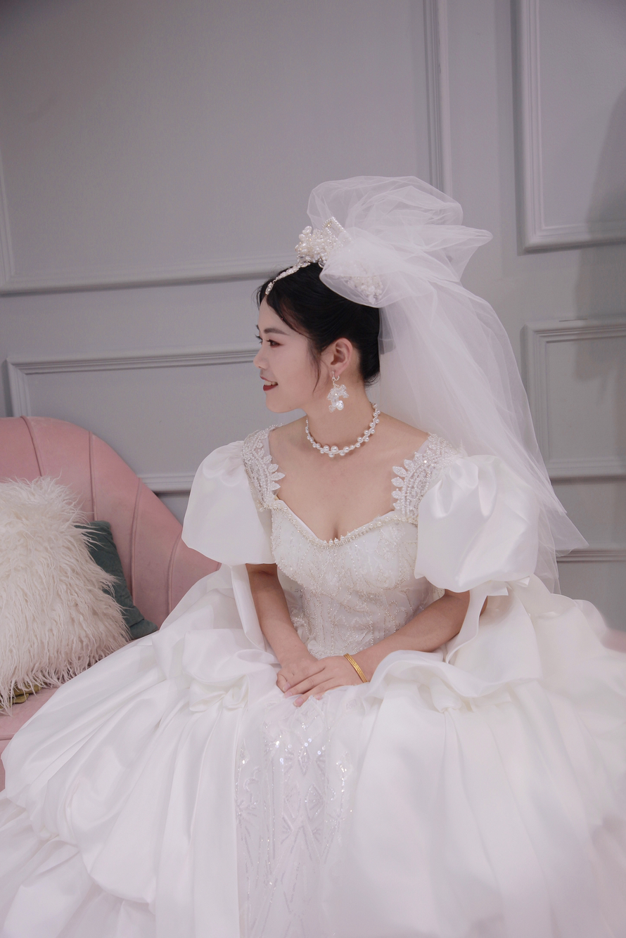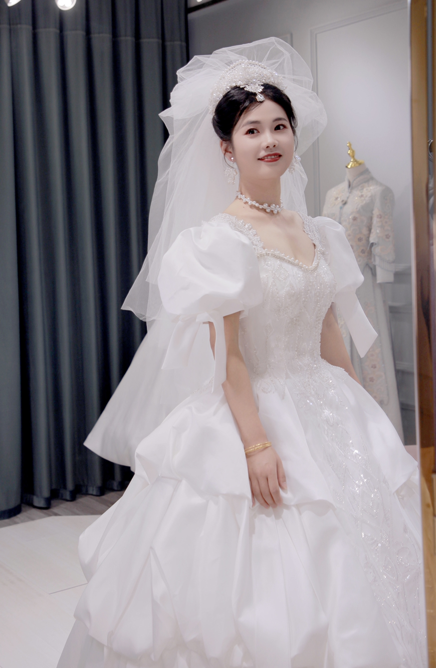 泡泡袖缎面齐地婚纱