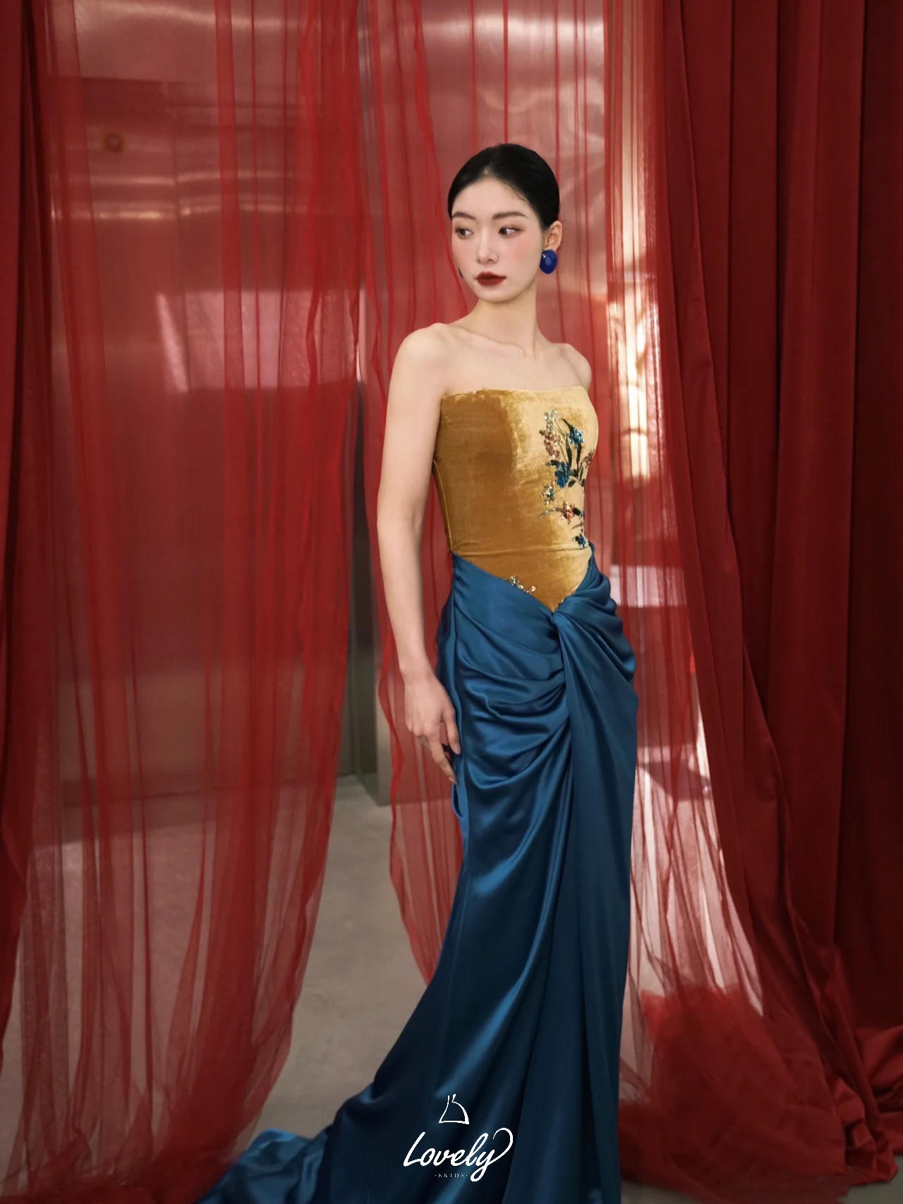 撞色设计的新中式礼服