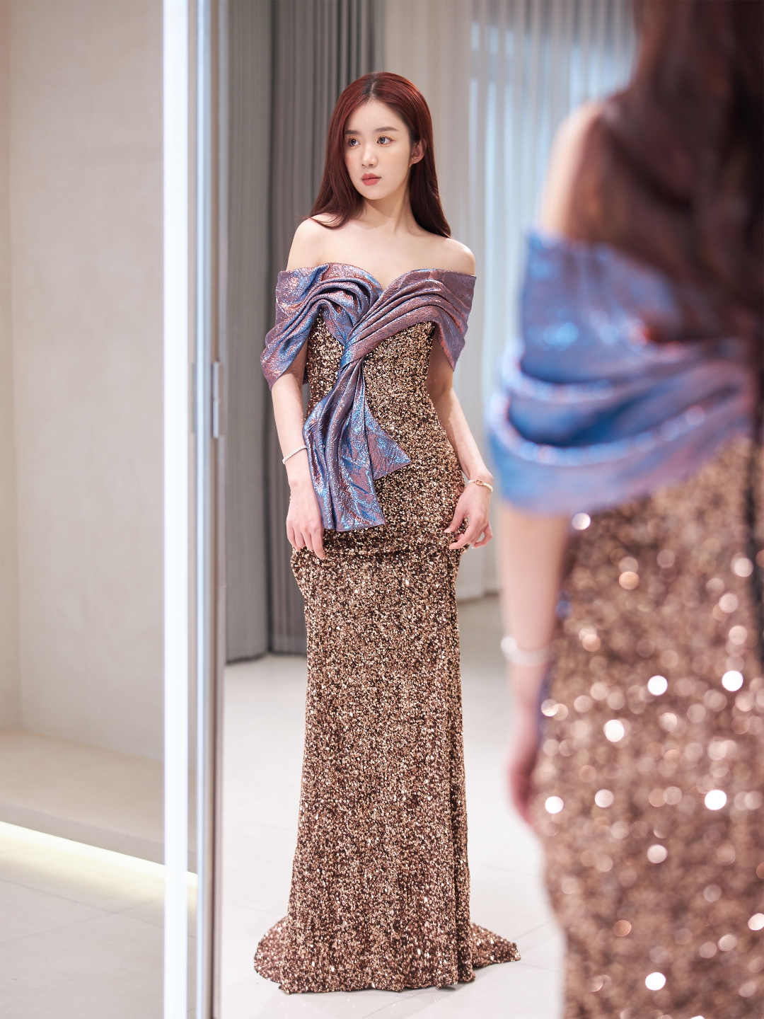 一字肩亮片敬酒服