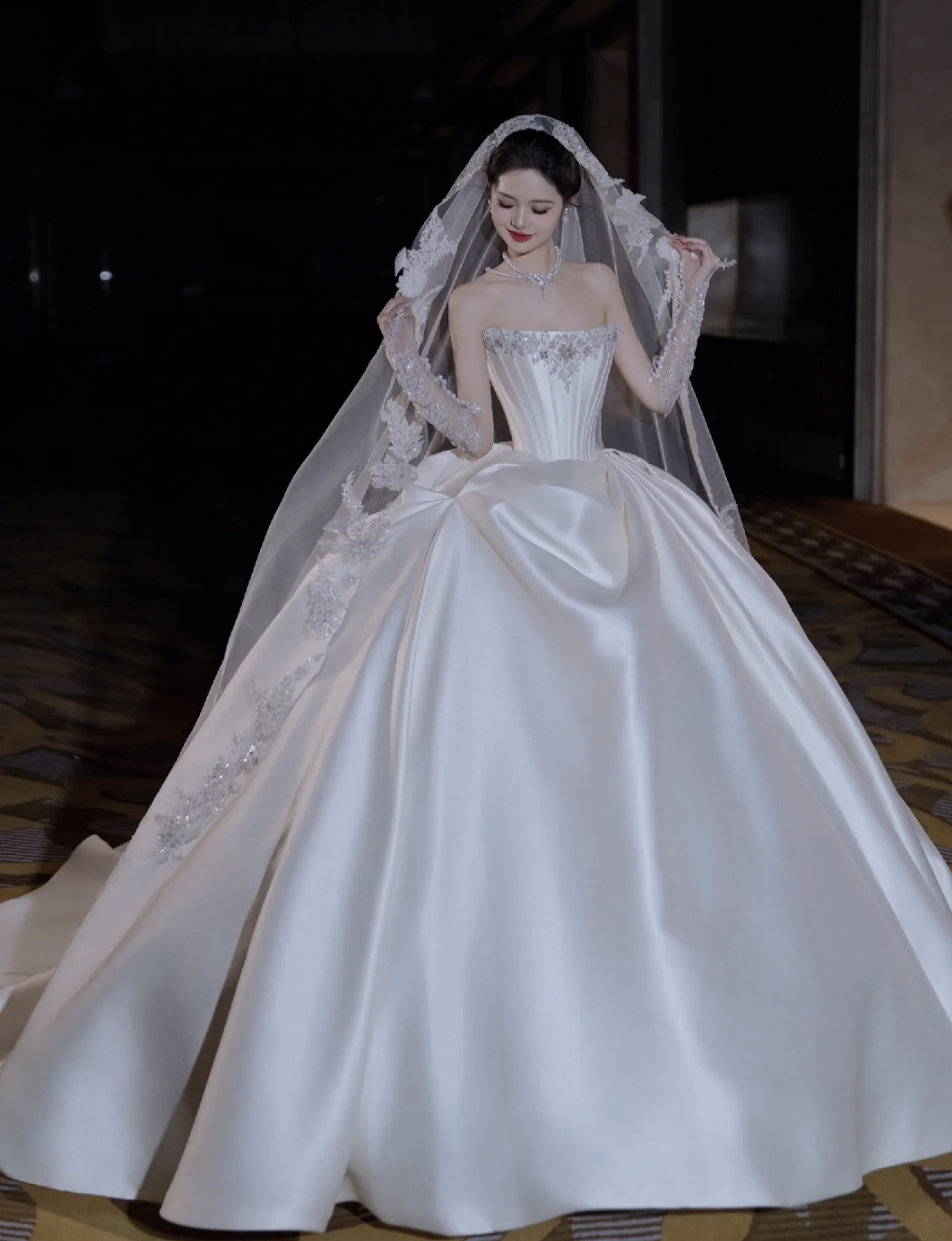 长袖V领天鹅颈主纱