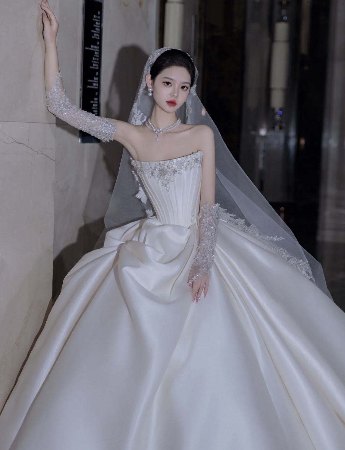 长袖V领天鹅颈主纱