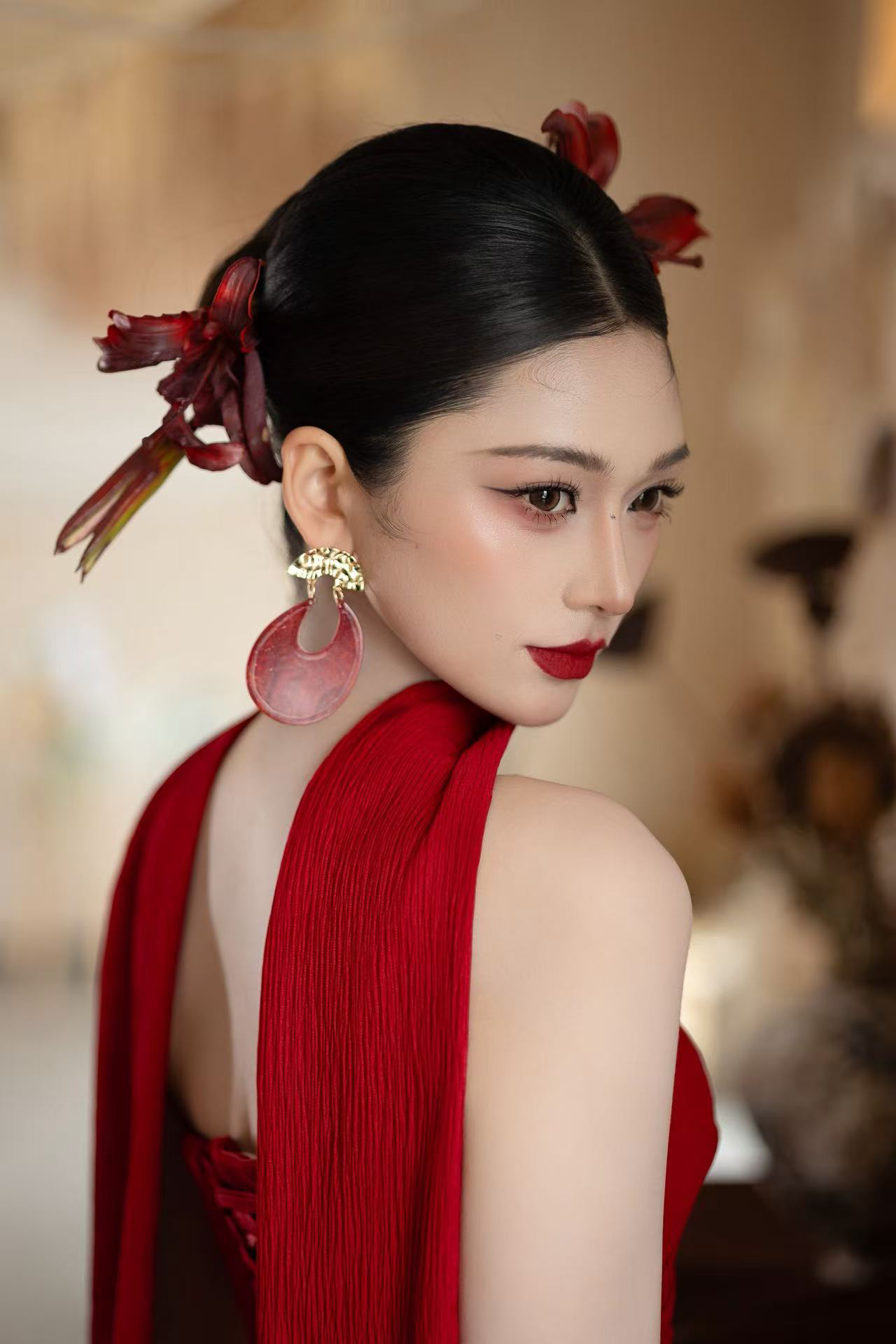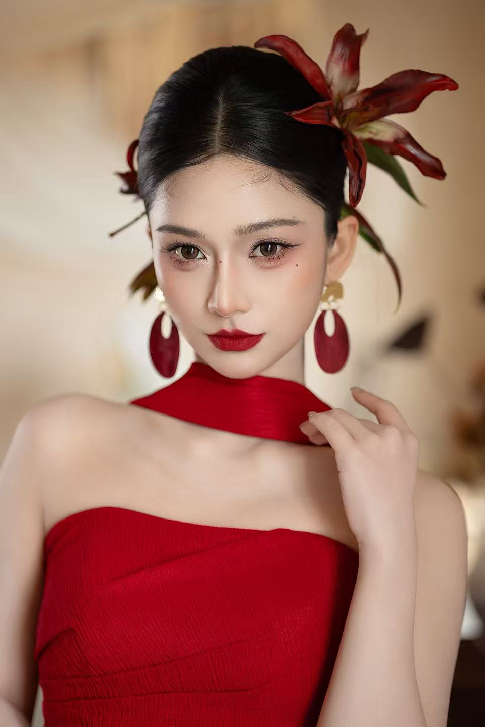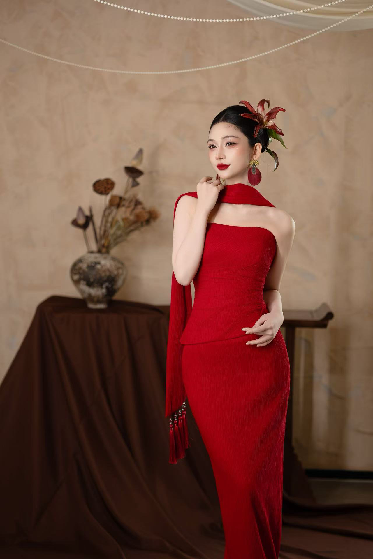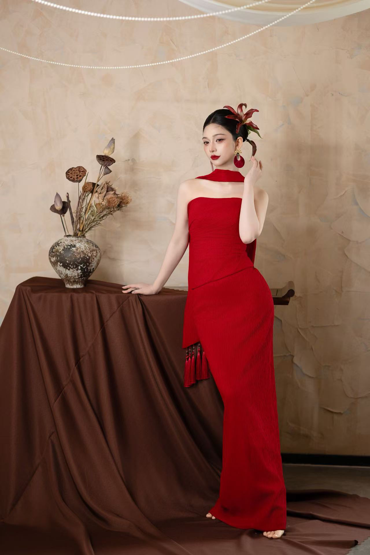 正红肌理感抹胸鱼尾裙