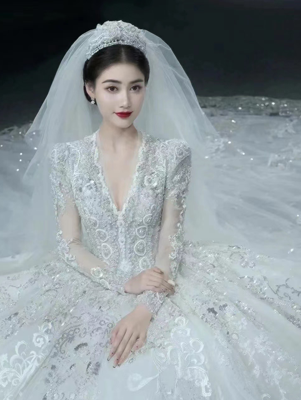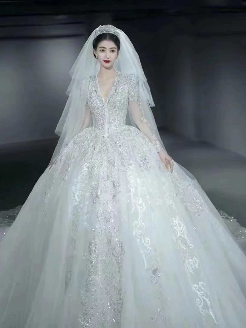 白陶大拖尾长袖缎面婚纱