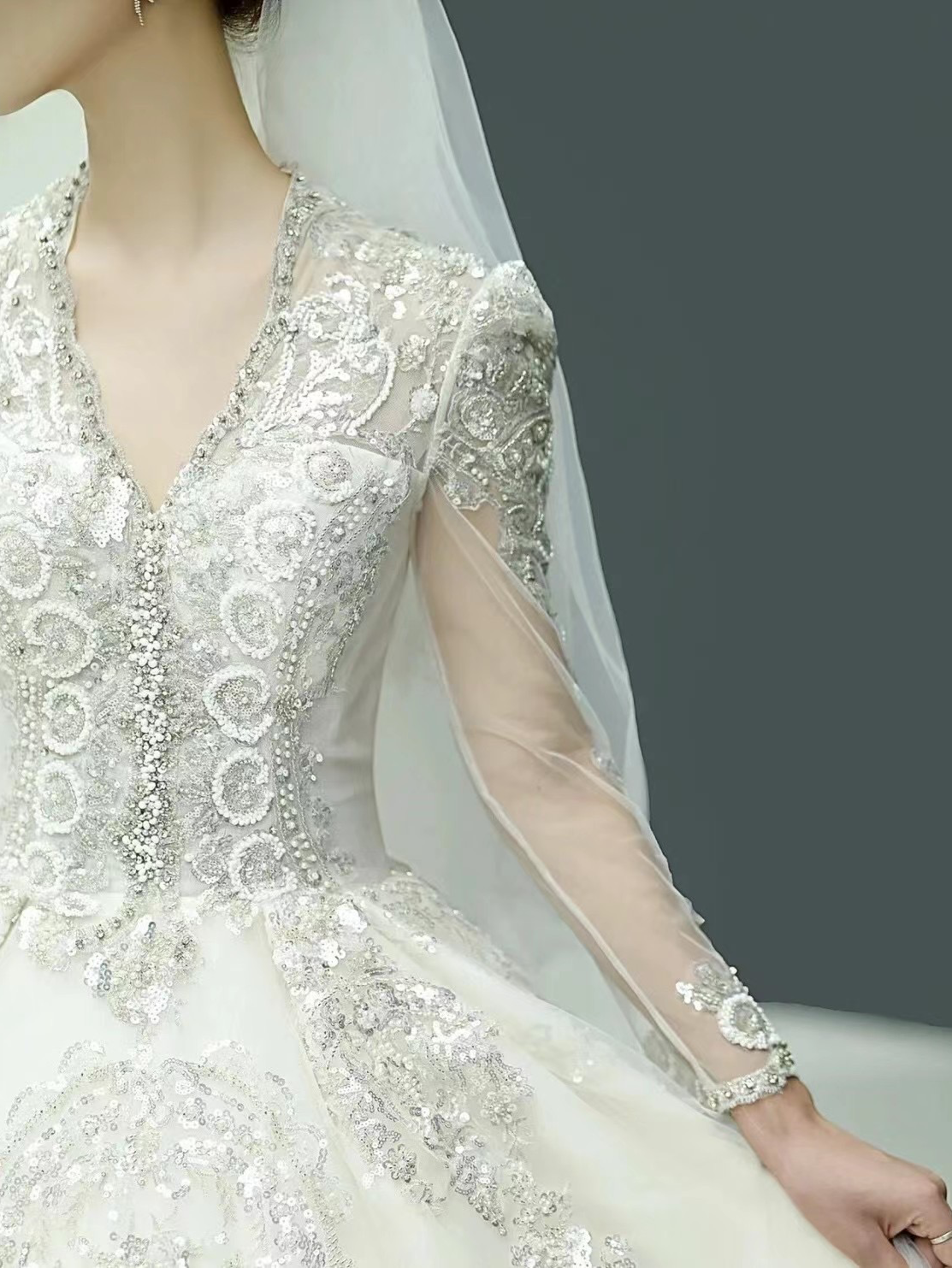 凯特王妃长袖皇后领大拖尾显瘦婚纱