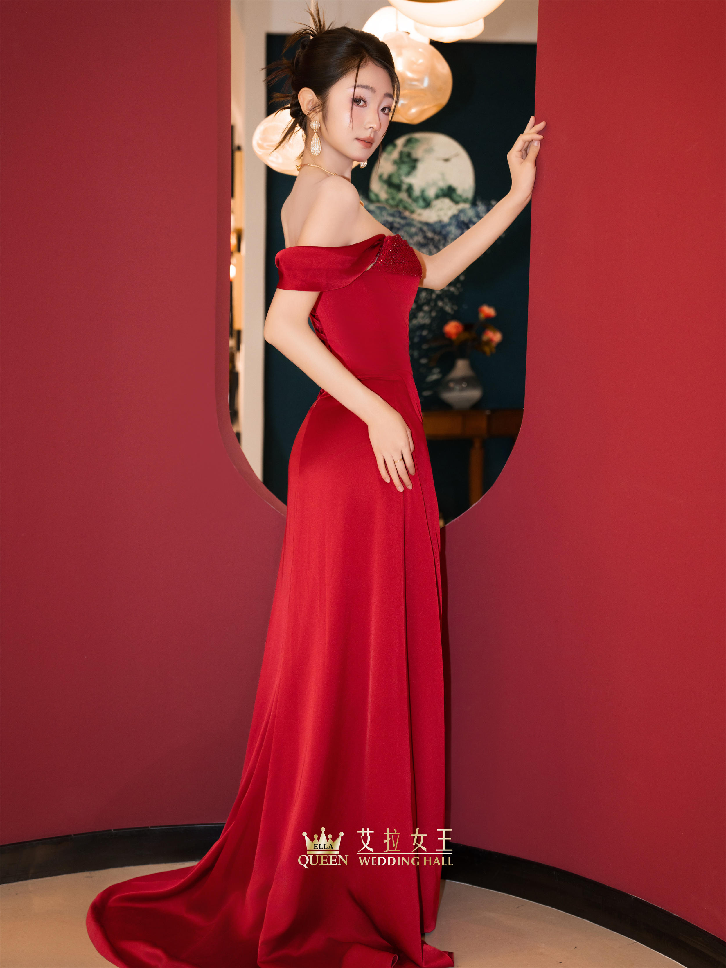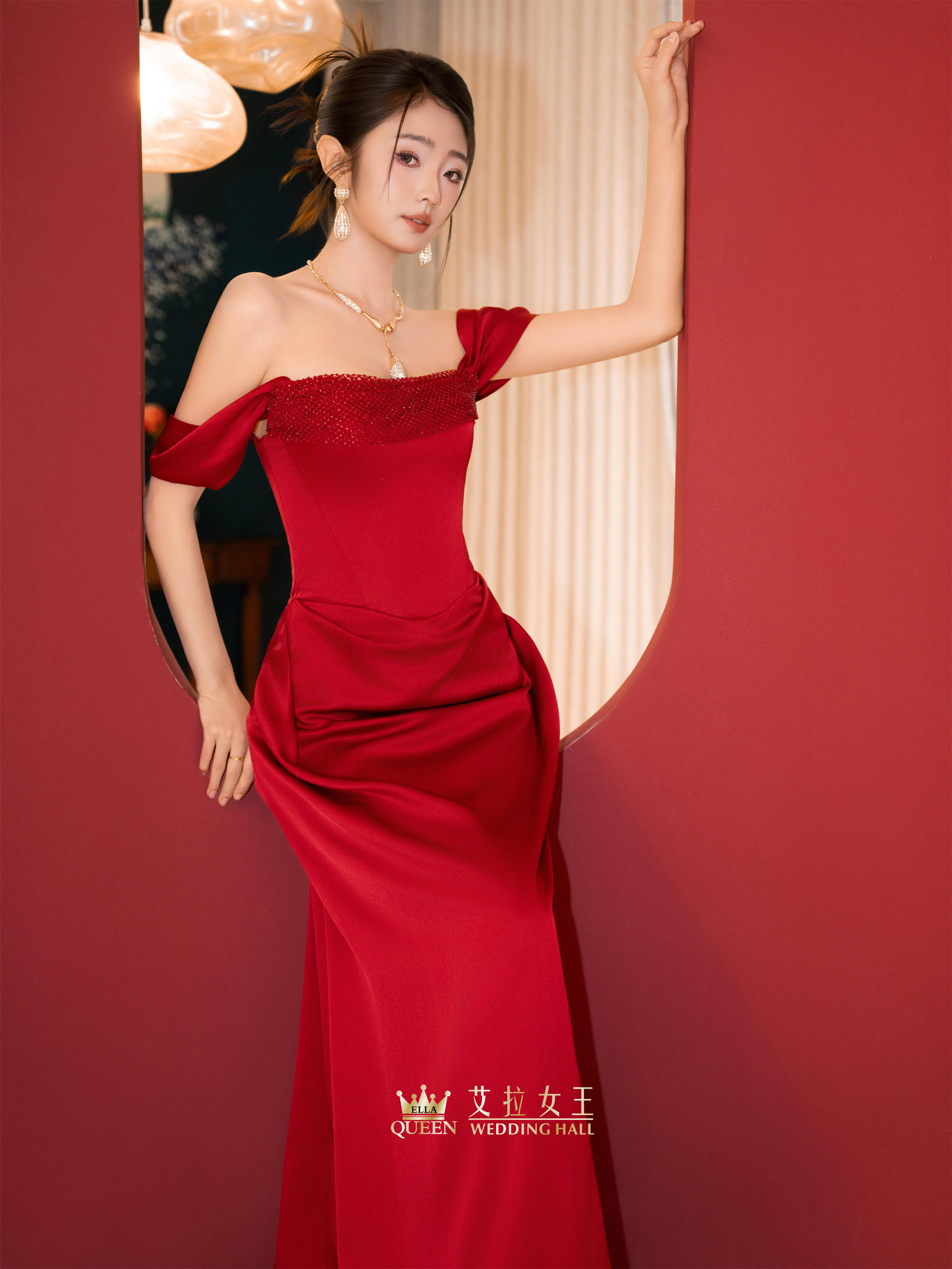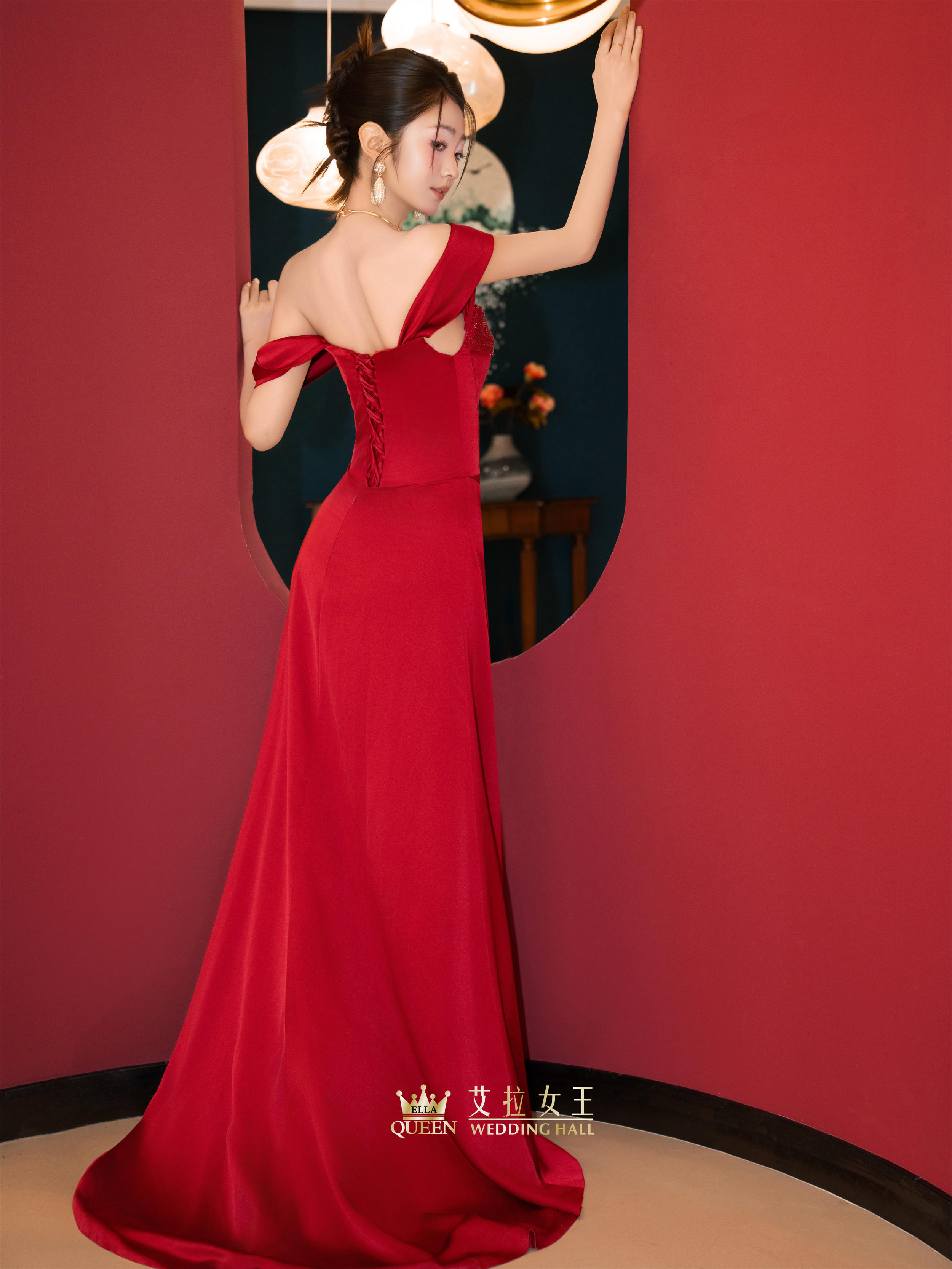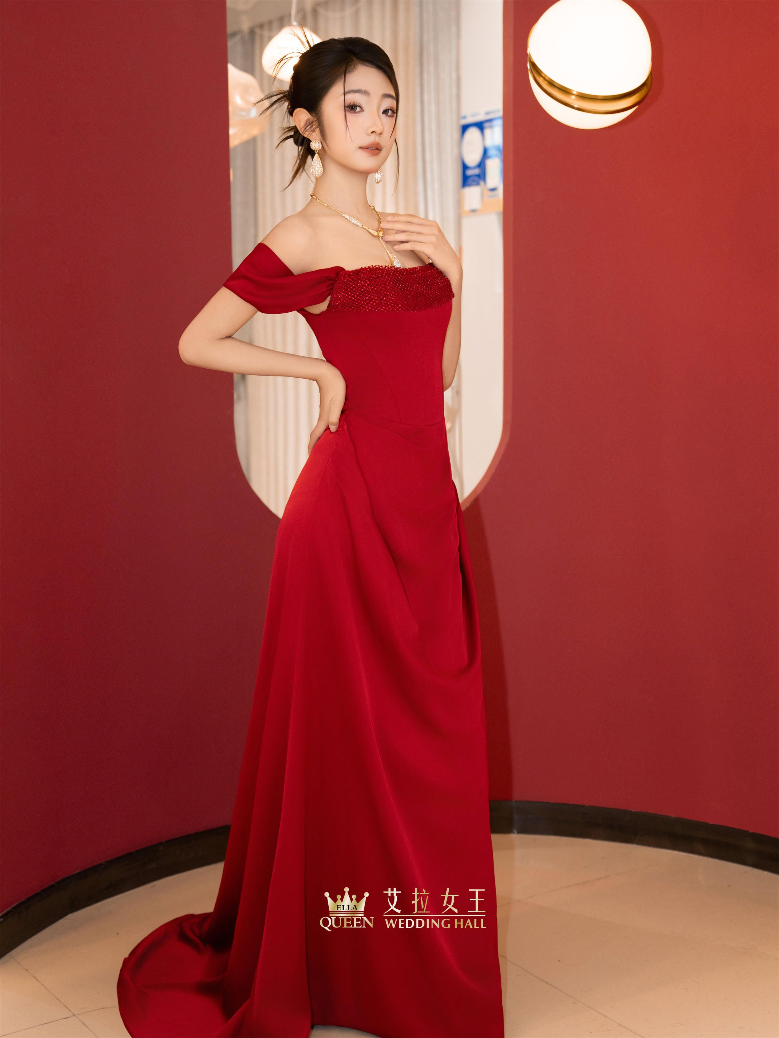 【优雅馥郁】红色缎面一字肩敬酒服