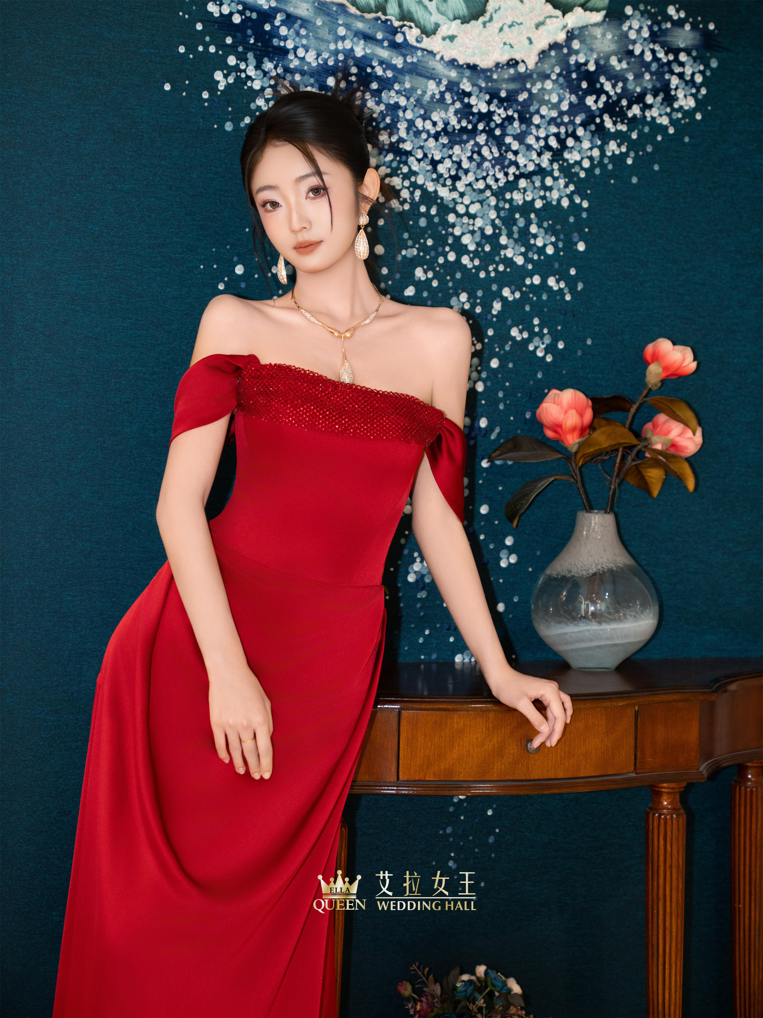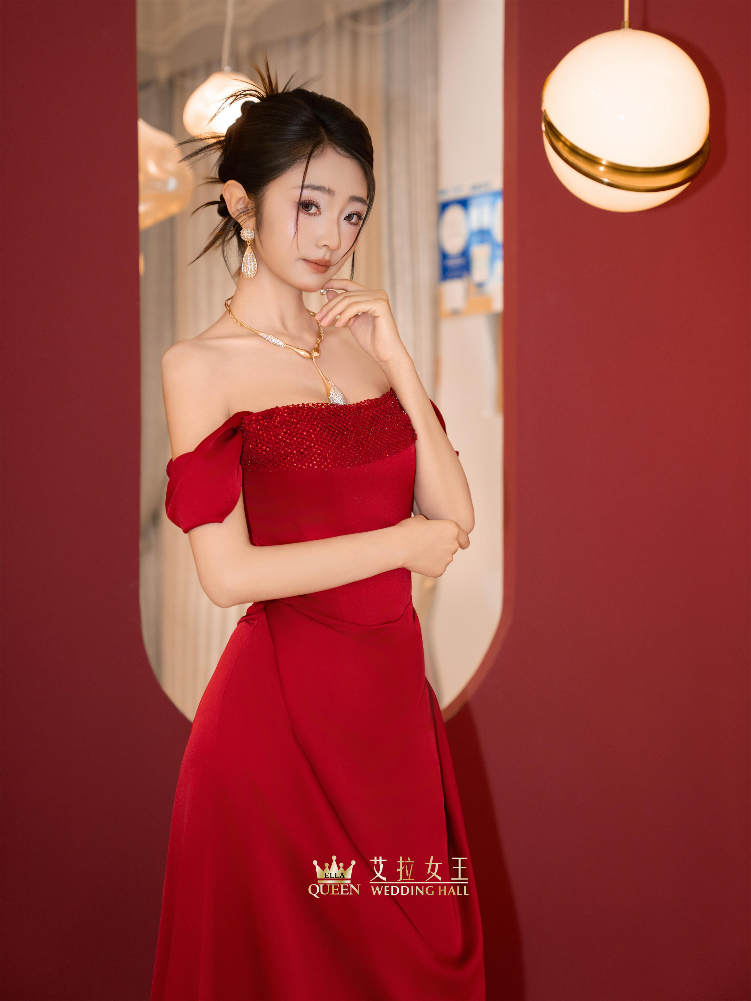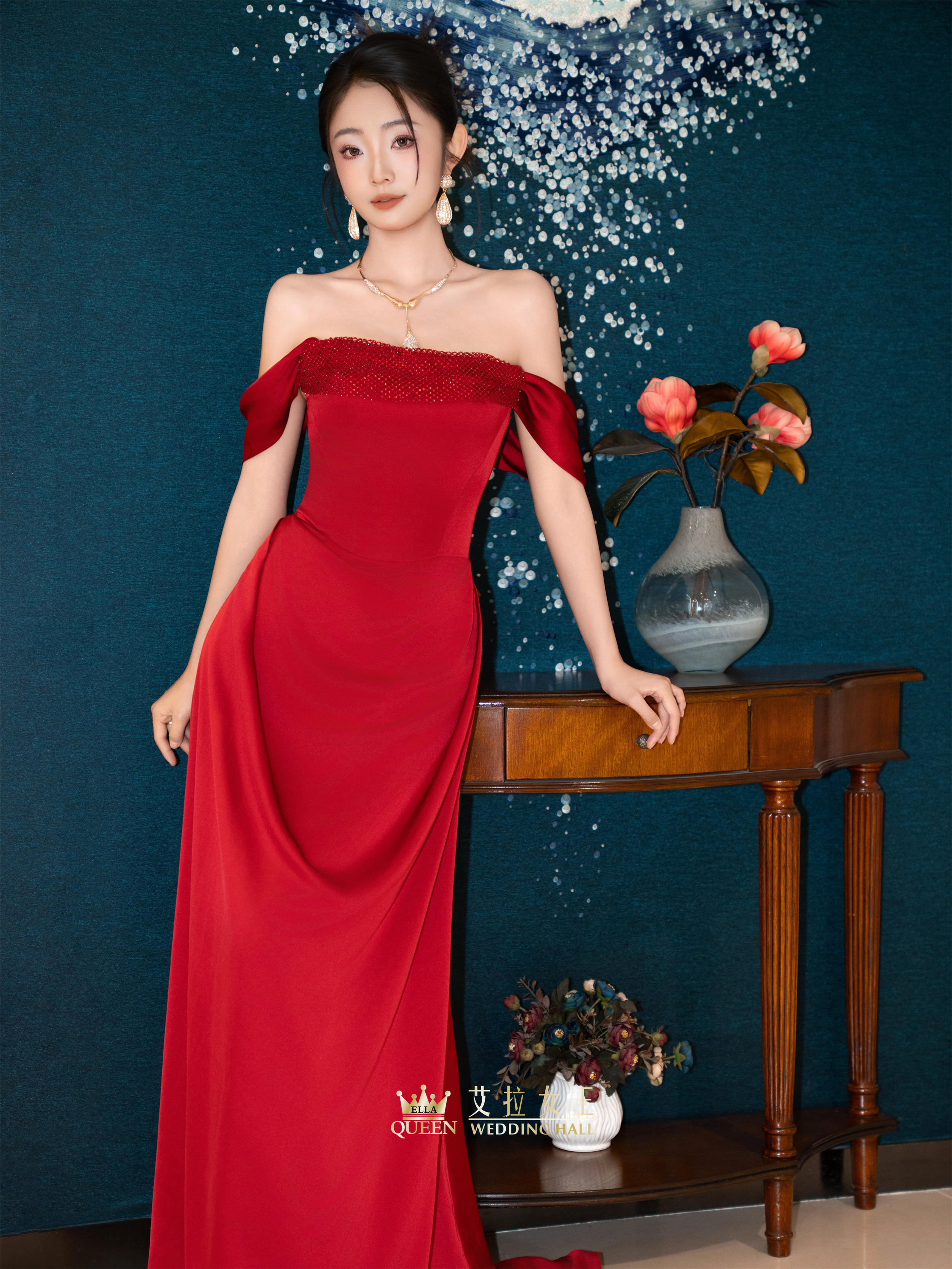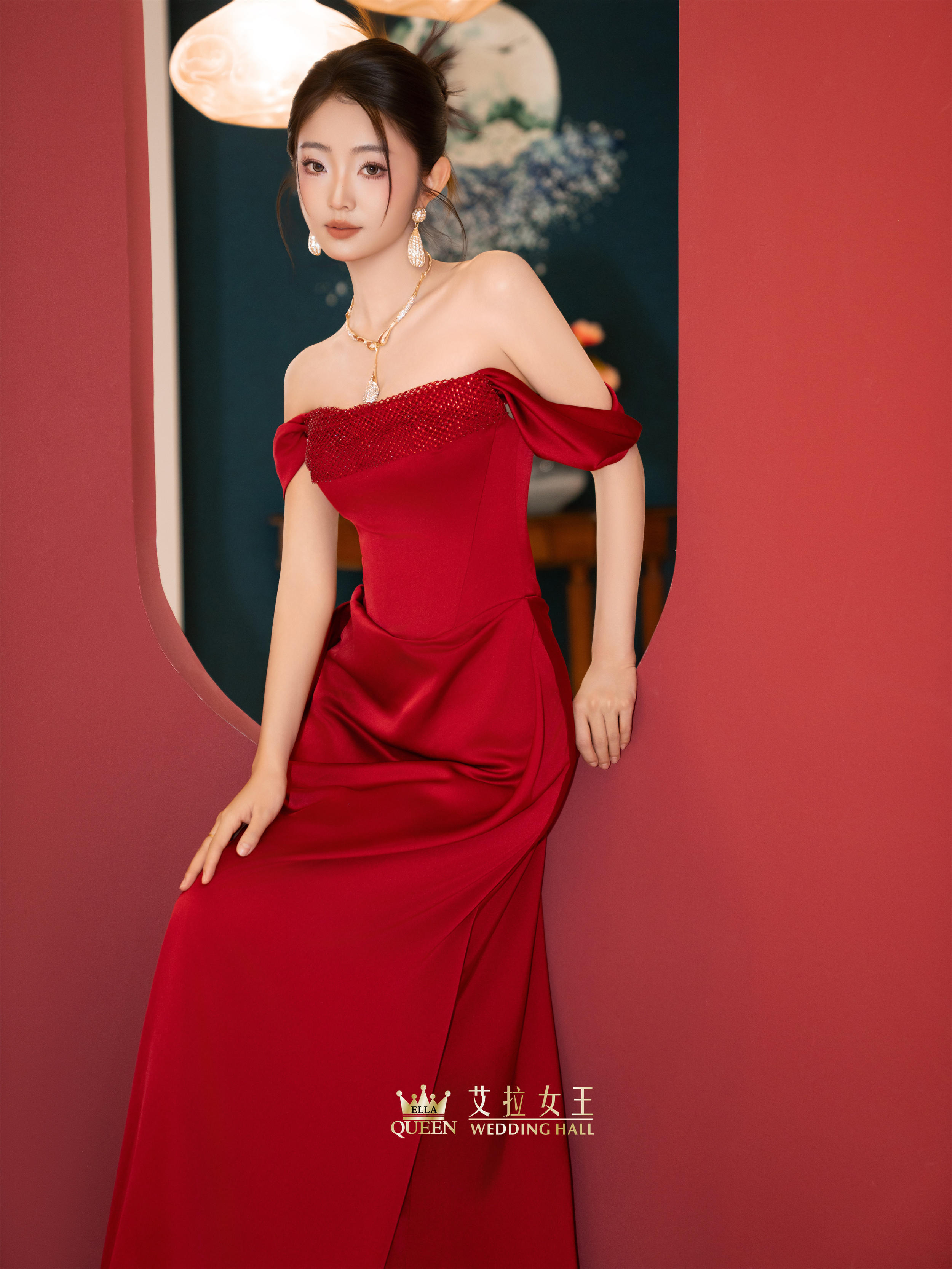 【优雅馥郁】红色缎面一字肩敬酒服