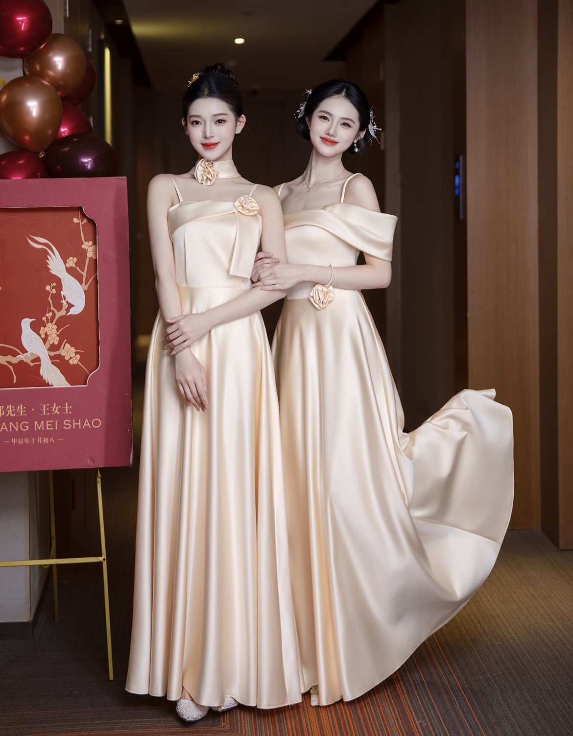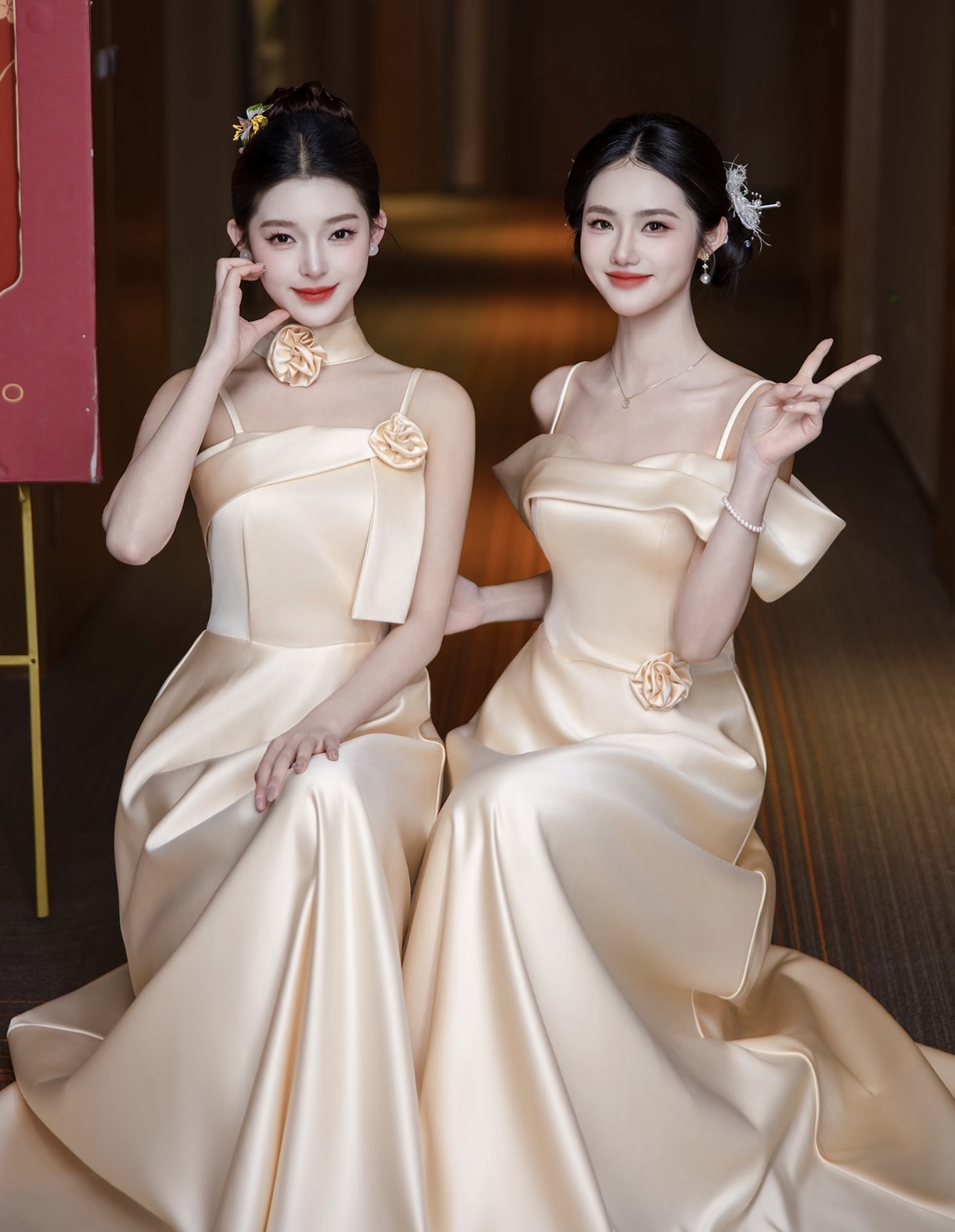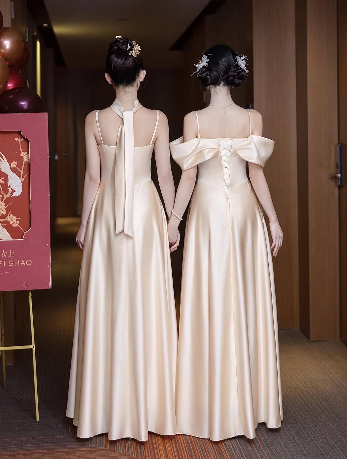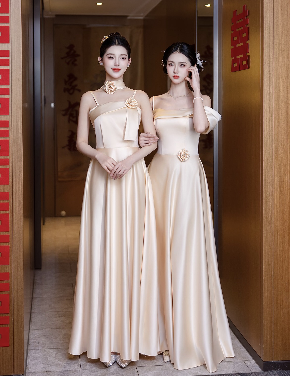 香槟色缎面伴娘服