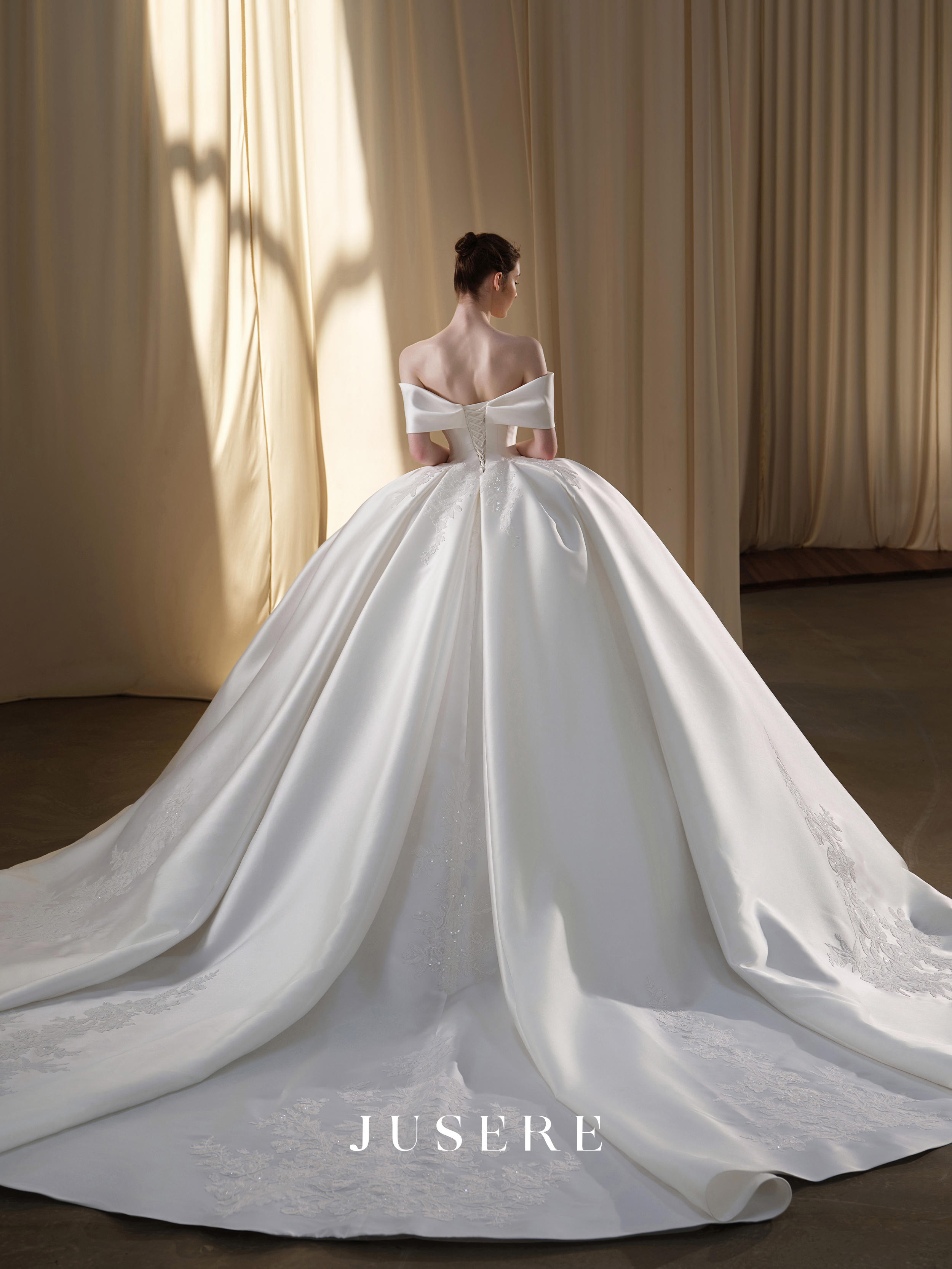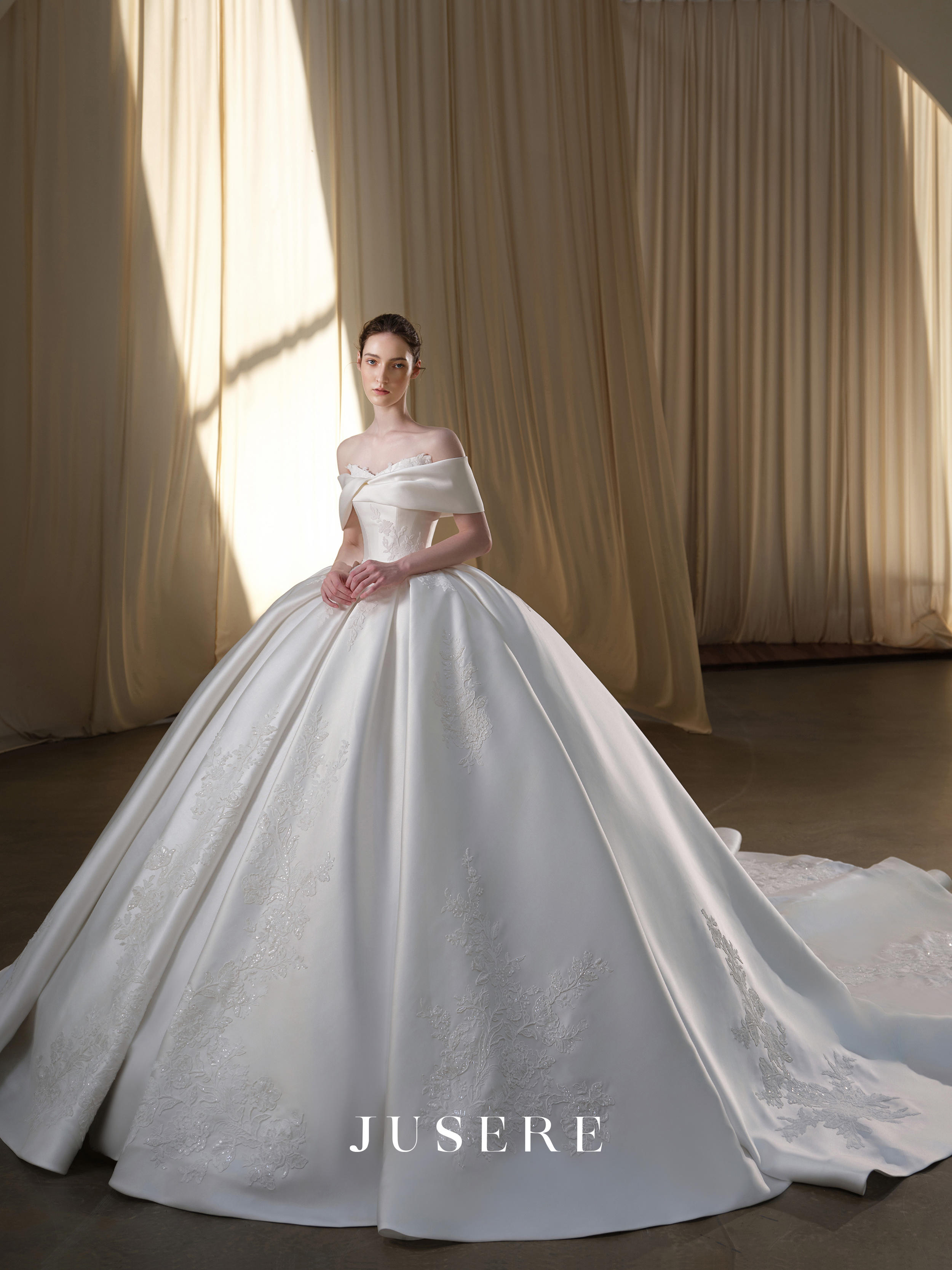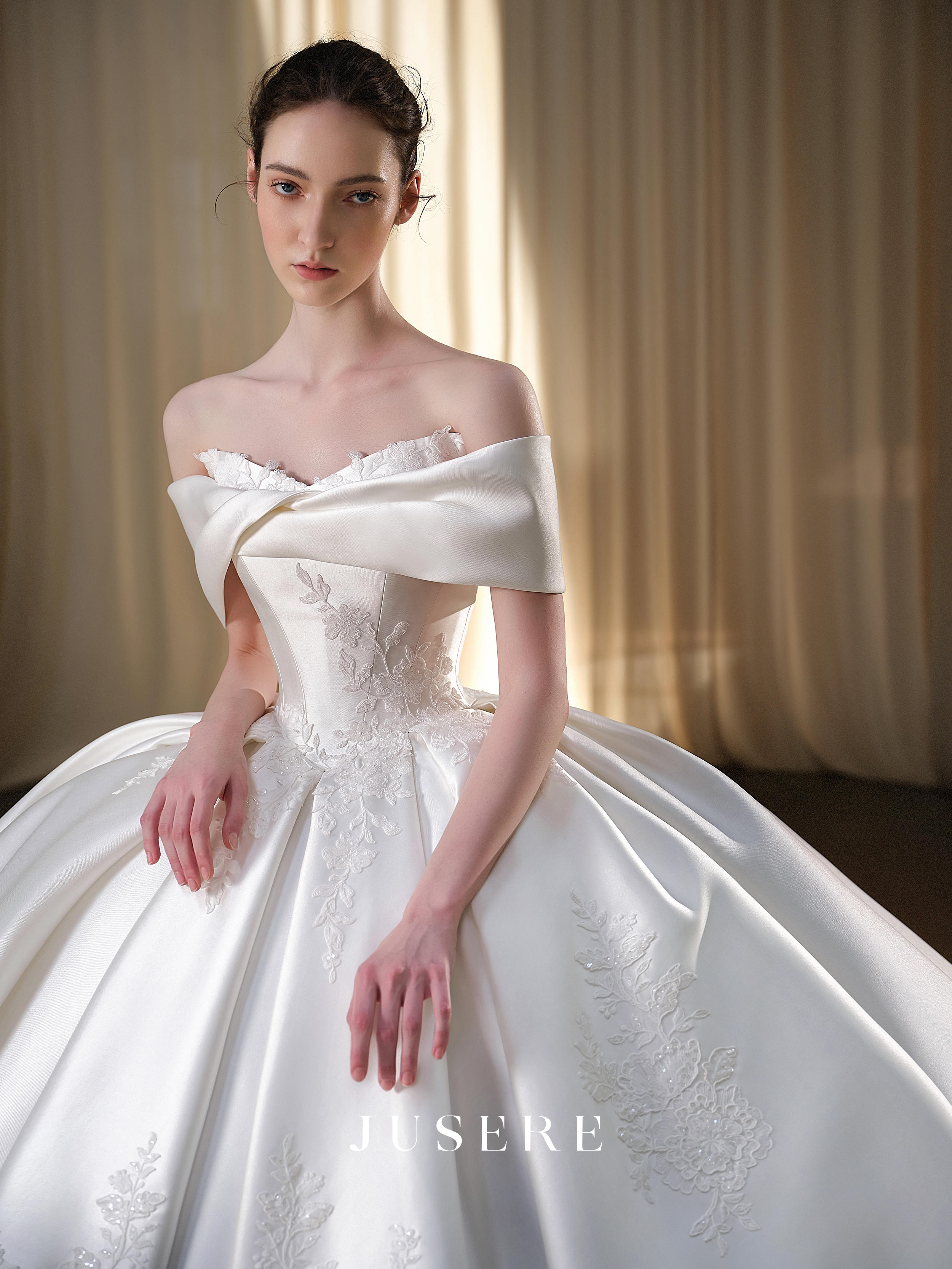 一字肩缎面主婚纱