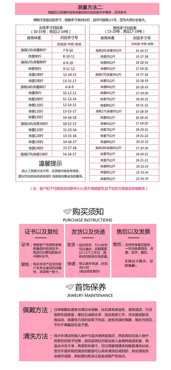 1.戴戒指要避免碰撞,碰撞会造成戒指变形或者使戒指的爪松脱,容易造成戒指变形。 2.避免接触化学物质,以免造成戒指腐蚀。 3.定期清洗戒指,清洗钻石戒指时记得将洗手槽的排水孔关好,以免出现戒指被水冲走的情况。