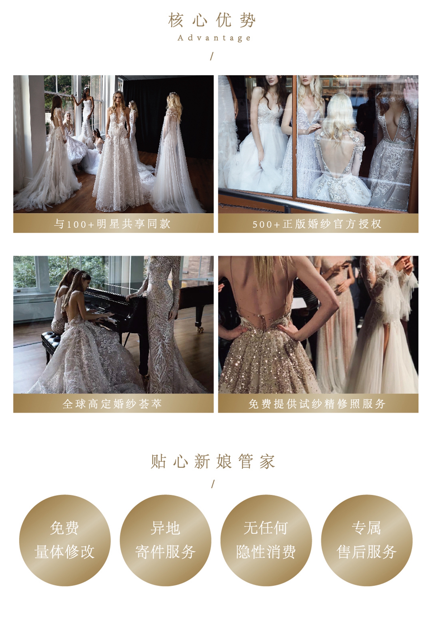 Bridal Queen——汇集全球一线婚纱品牌<br />< 奢品系列>热卖指数:☆☆☆☆☆<br />出门纱1件+仪式纱1件+敬酒服/中式+伴娘服2件+韩国品牌头纱1条+全套配饰+男装一套=12999(原价值25000+)<br />参与品牌:NOYA、Milla Nova 、Pronovias、MoriLee、Casablanca、Tarik Ediz、AllureBridal、Nicole、Spoensha、The Atelier、DOVITA、Vera Wang、Dovita、NICOLE、Crystal Design、It’smyparty、WINK、JennyPackham<br />设计师品牌(部分款式)
