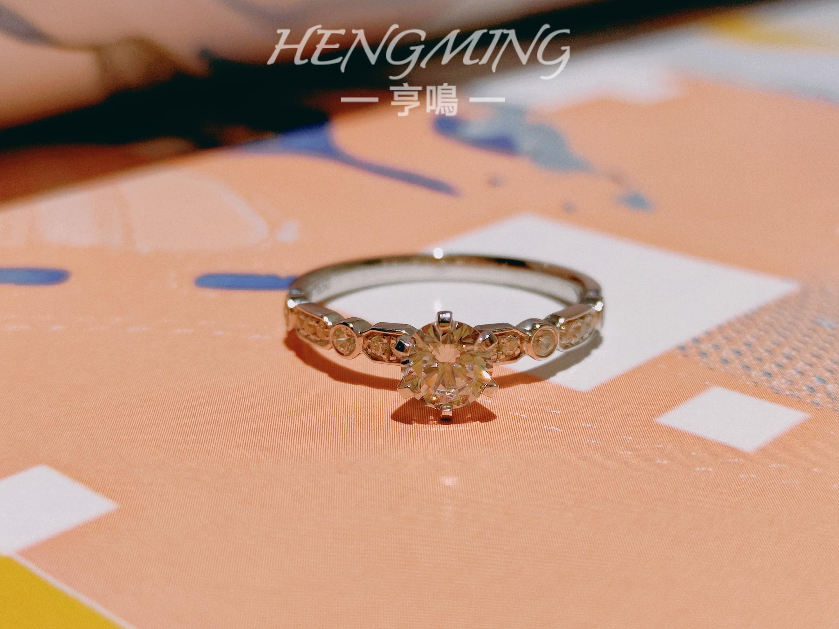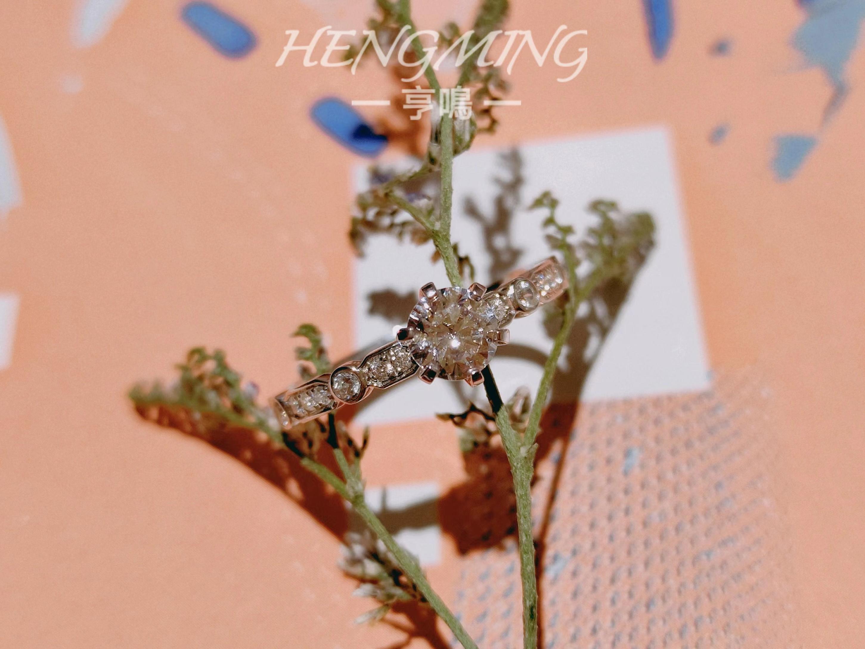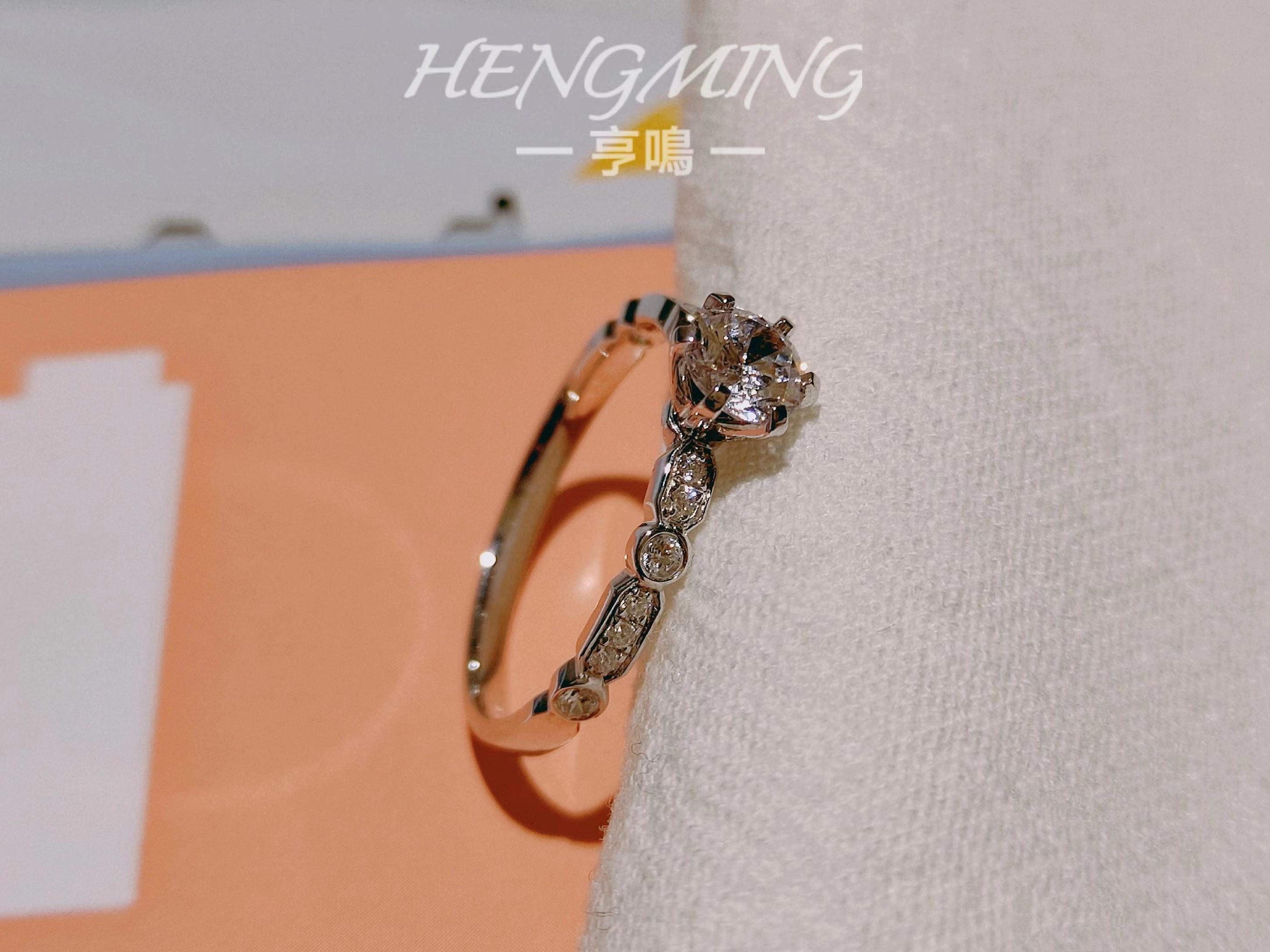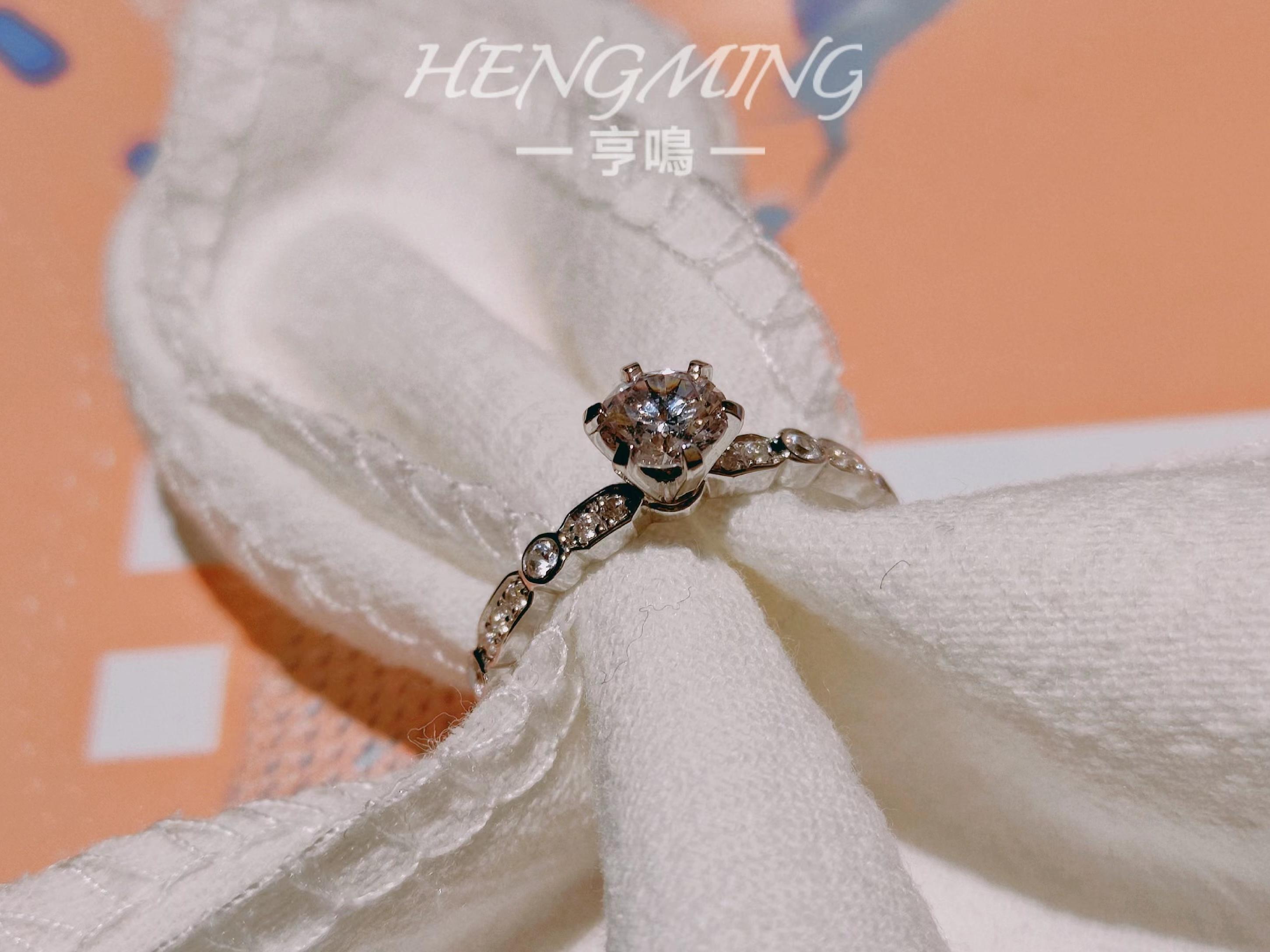 『我瞒着宇宙山河,悄悄想了你一下。』<br />——【朝露】——<br /> <br />简约与设计感并存的一款钻戒,经典六爪拥抱主钻,戒臂用不规则几何图形镶嵌小钻,如露珠滑过叶脉留下的踪迹。上手清新精致,又因为不规则几何的戒臂造型展现满满设计感