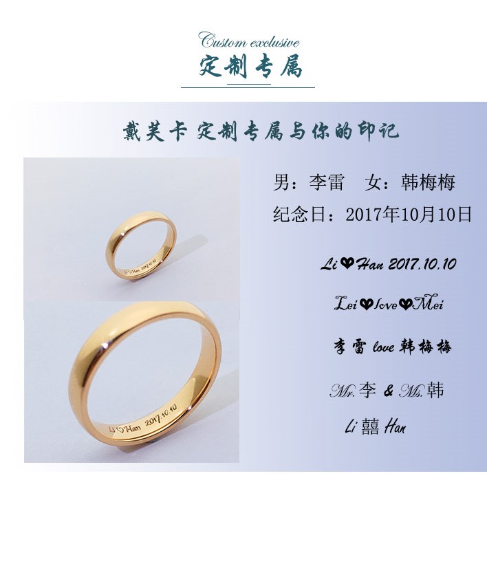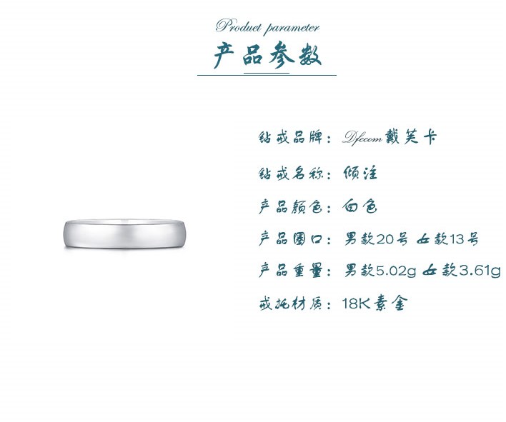 钻戒品牌:Dfccom戴芙卡<br />钻戒名称:倾注<br />产品颜色:白色<br />产品圈口:男款20号 女款13号<br />产品重量:男款5.02g 女款3.61g<br />戒托材质:18K素金<br />